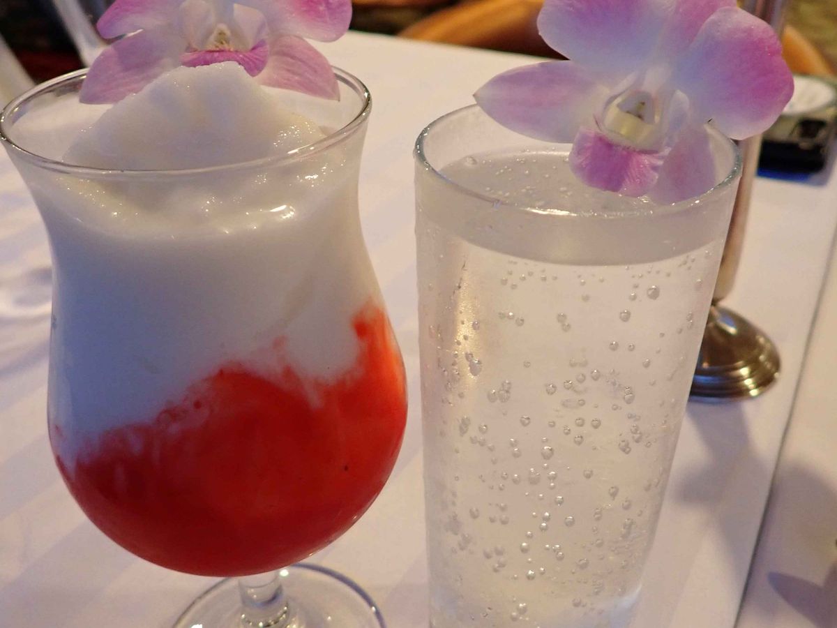 ウェルカムフラに迎えられて乗船すると、最上階である4階までエレベーターで・・・グランドピアノが置いてある落ち着いた船内で、窓際の席に案内され、ウェルカムシャンパン。アルコールが苦手と伝えると、ノンアルコールのシャンパンをもってきてくれました。