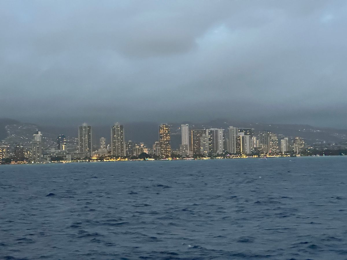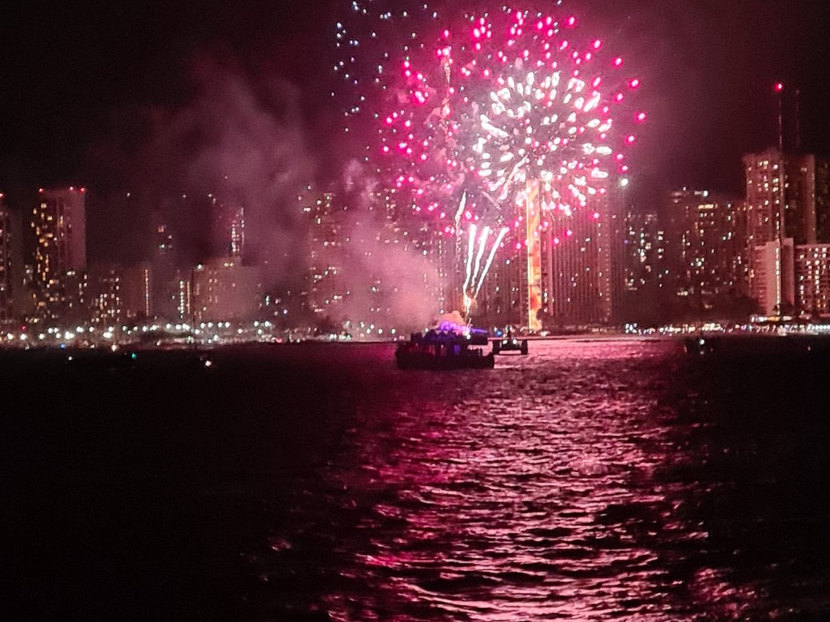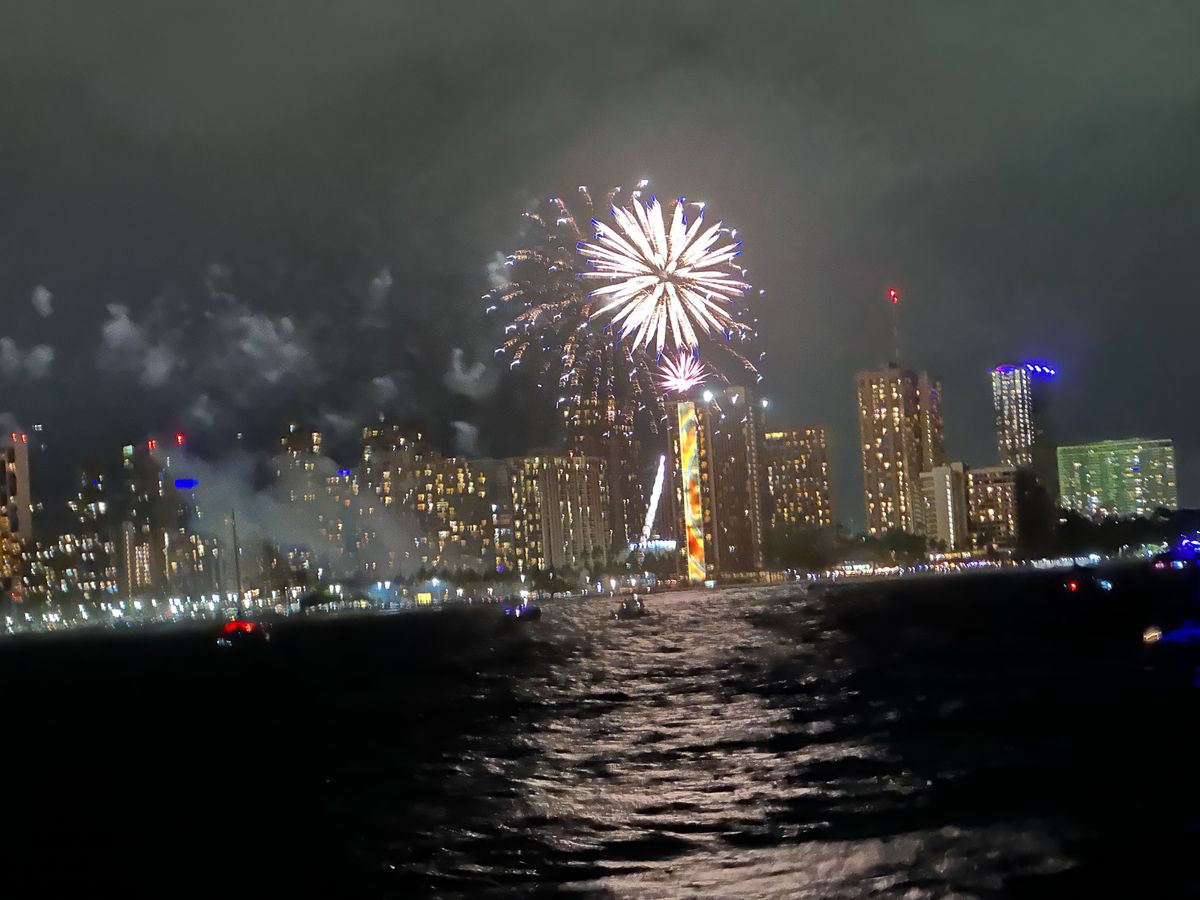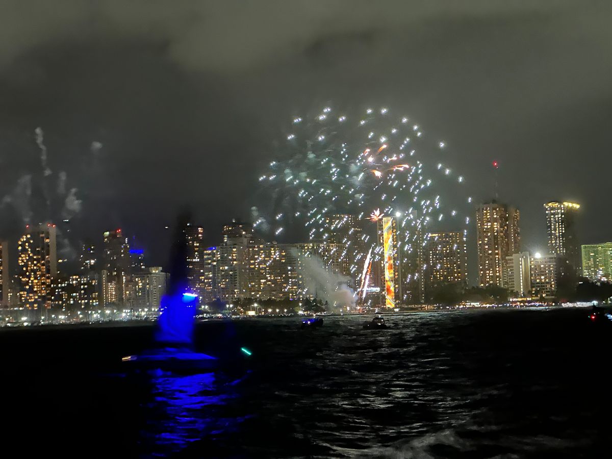 ワイキキの街とともに見る花火は、洋上からしか味わえない最高のものでした。