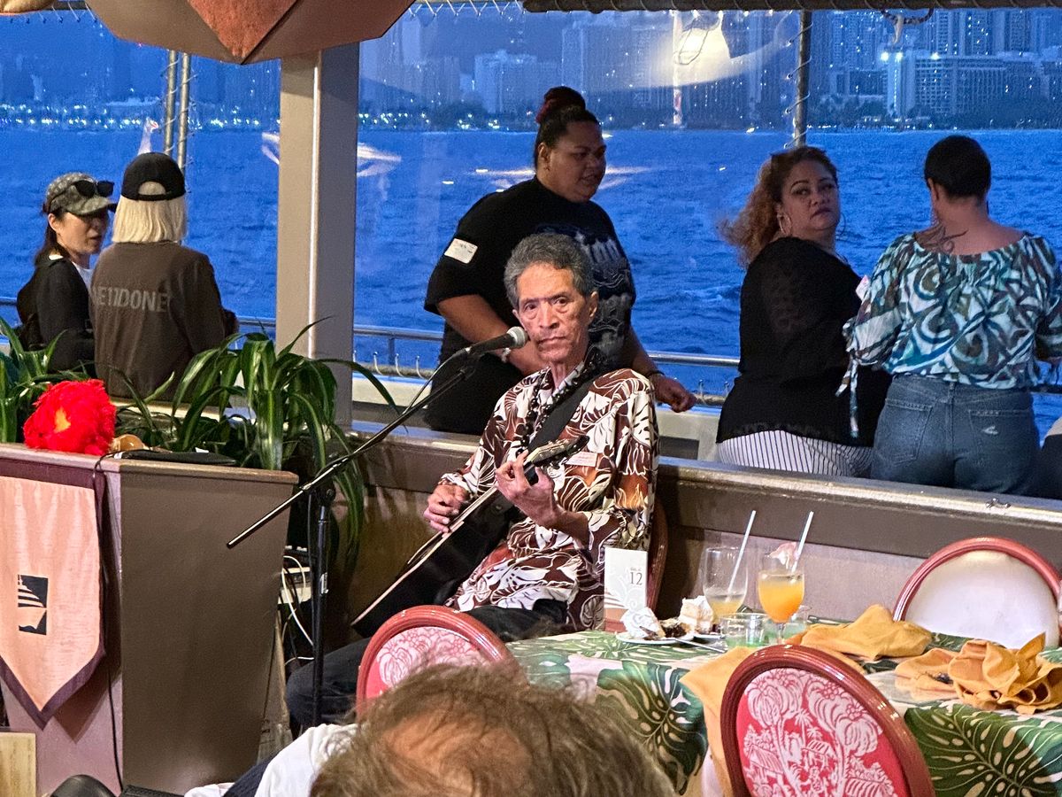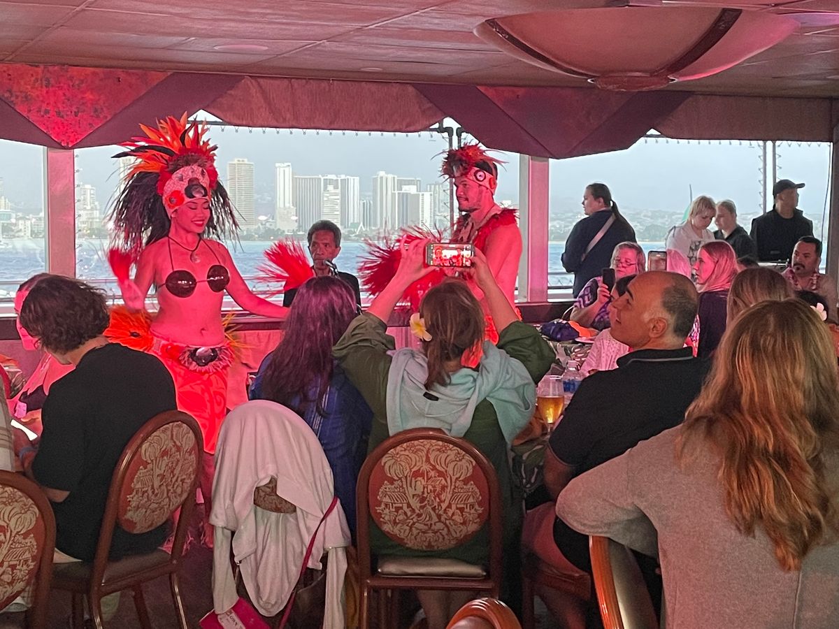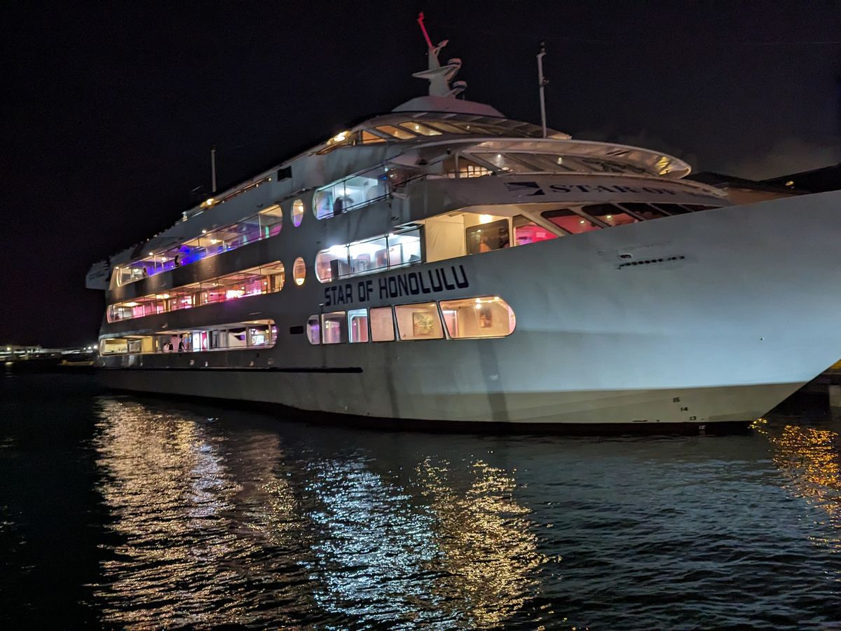 Our evening on the Star of Honolulu was an excellent experience! Ample parking was easy and accessible with 2 lots within walking distance. The check-in process was a breeze, make sure your voucher is ready. Waiting to board we were entertained with local dancers and music. Time to board! We were sorted by class and our trip to the top deck was a nice elevator ride up. We were seated at a nice intimate table with large window perfect for viewing. First on the table was a charcuterie board with tasty cheeses, meats and fruit. Don’t forget the champagne! As the cruise got underway were able to chat with the guests seated next to us. The dancers and singers provided more entertainment as we departed. The music throughout the night was relaxing.