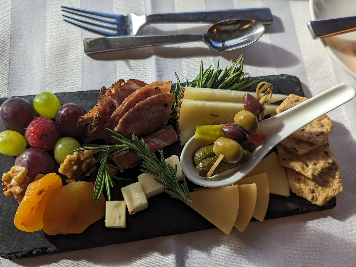 席に着くとすでにナッツチーズ生ハムドライフルーツ等がたくさん乗ったおつまみがすでにテーブルにありました。ウェルカムシャンパンもすぐに提供されました。どれも美味!