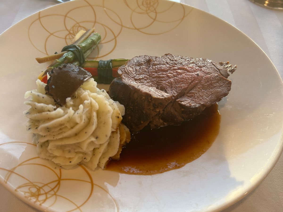 船内に戻ると、待っていたようにメインであるプライムテンダーロインビーフを持ってきてくれ、ジャズ音楽とともに堪能しました。肉がとても柔らかく、簡単にナイフで切れます。デザートもとてもおいしかったです。