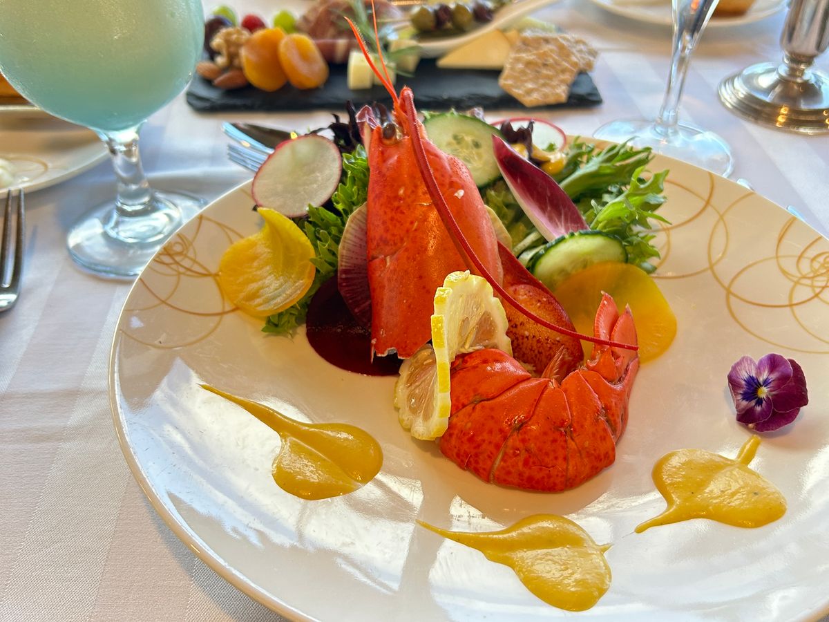 出港すると、ピアノの生演奏が始まり、早速食事。前菜に始まり、メインロブスターのサラダとフルーツシャーベット、2杯目の飲み物はブルーハワイ、これもノンアルコールがありました。