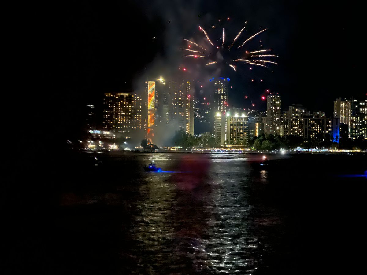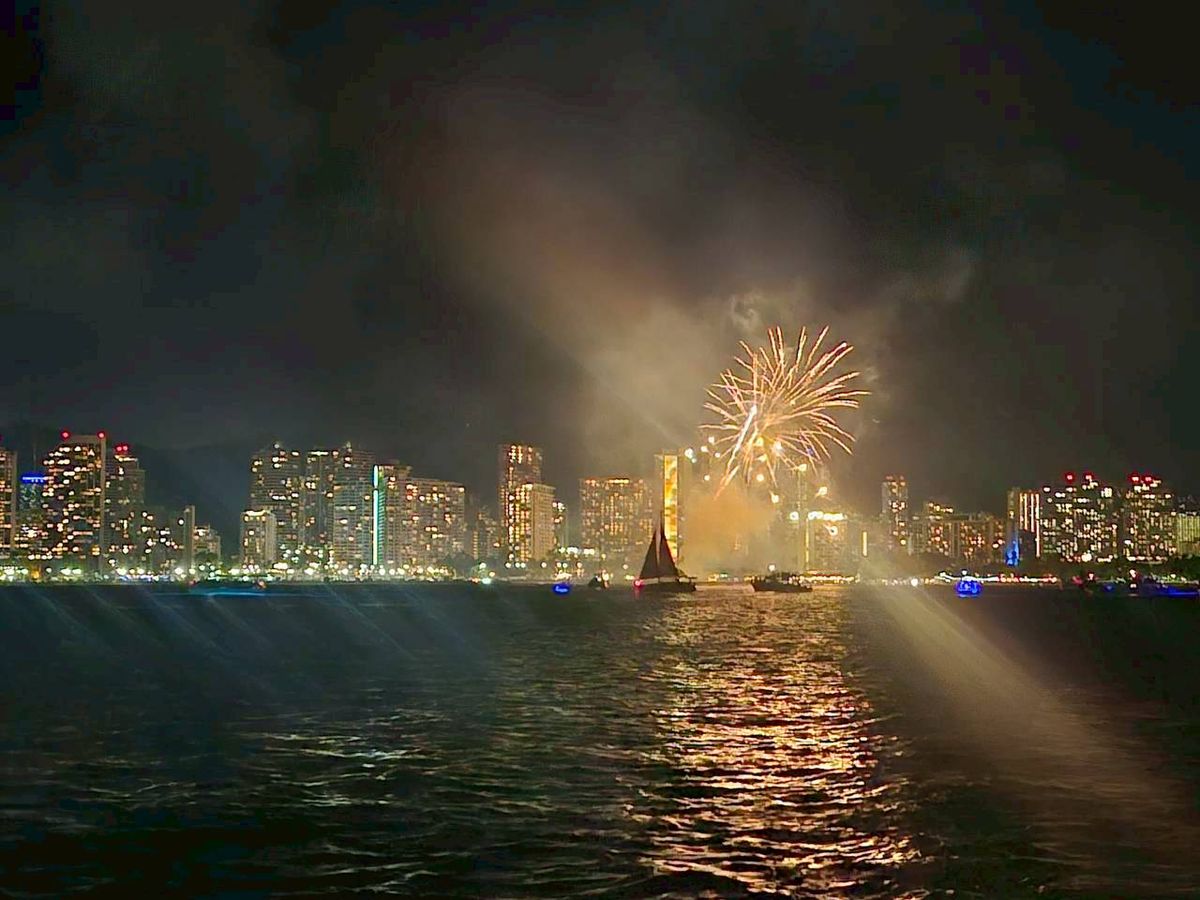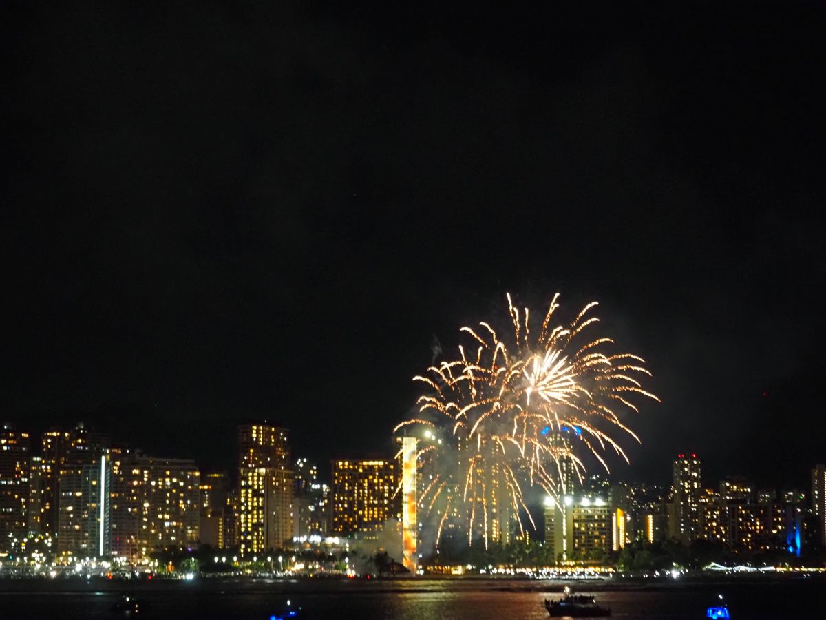 隅田川の花火大会で屋形船に乗るのは至難の業である。ここホノルルのサンセットクルーズの金曜日は船上からサンセットと花火を見ることができる。食事と心地よい風ですこぶる気持ちがよかった。