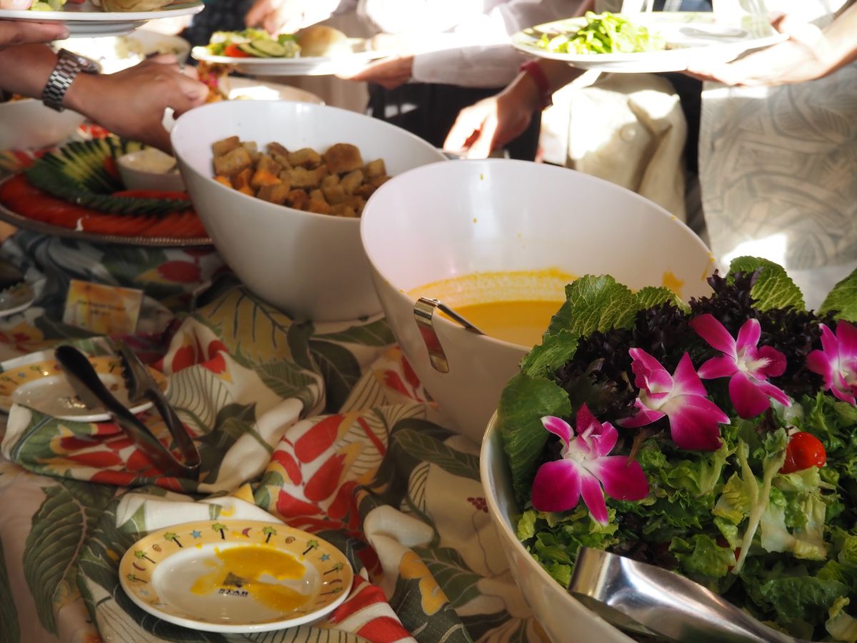 今回はブッフェスタイルでしたが、早めに到着したのでウェルカムサービスでフラを見たり写真を撮って頂きました。