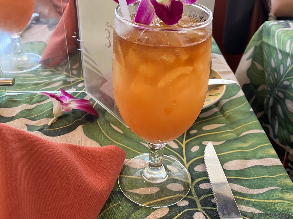 マイタイ一人一杯付いていて、アルコール?と聞かれイエスと言うとアルコール、子供や飲まない人にはノンアルのが来ます。