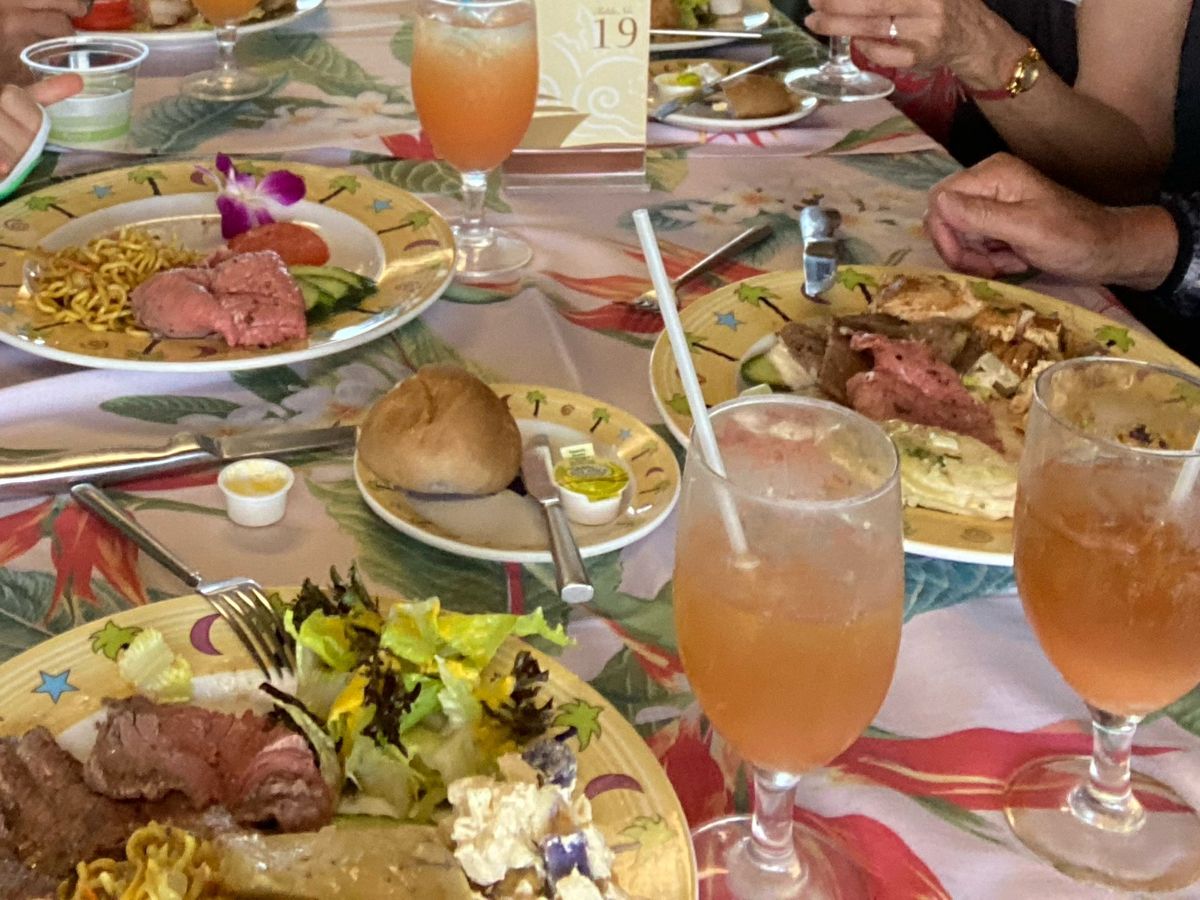 ビュッフェスタイルで参加しました。飲み物が運ばれたあと、料理を取りに行きました。種類も量も十分あります。フラのショーは衣装や小物を替えながら、何曲も踊ってくれて楽しめました。夕日が沈む時はデッキに出て写真を取り良い記念になりました。