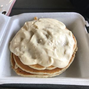 名物のマカダミアナッツパンケーキORオムレツ(ノーマル・シーフードの2拓)です。私はブーキモのリピーターなので、オムレツは上記ではなく、ガーリックシュリンプオムレツが食べたくて、選択肢には無かったのですが、お店に頼んでもらいました。けれど、テイクアウトは、2拓と決まっているのか、お店側から断られてしまいました。(ガイドさんはお願いしてくれたけど、店から断られた)そこは残念でしたが、お店到着後、すぐ出来立てが受け取れて、待ち時間ゼロで食べることができました。(食べるのは、カイルアのホールフーズ中)