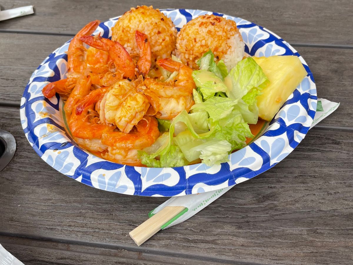 ①ノースショアでフリフリチキンとガーリックシュリンプを堪能