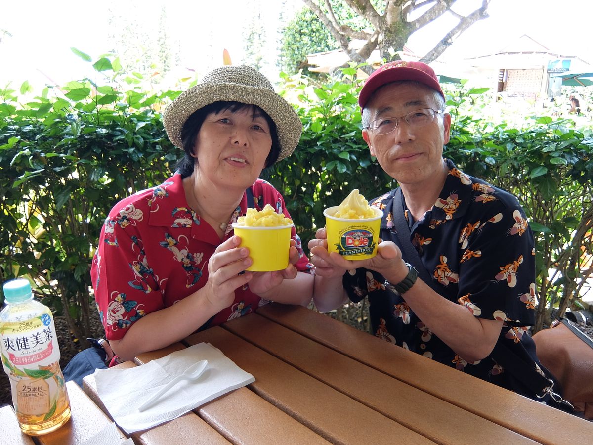 Doleプランテーションのパイナップルのソフトは、ちょっとシャーベット系で程よい酸味があったので、ボリュームが有ってもペロッと食べられました。サンセットディナークルーズ用のムームーもDoleプランテーションで購入しました。専門店に行くと20,000円位するからそこまでの物じゃなくていいなら5,000円位でも購入出来るとテリーさんから聞いていたので、ちょうど見つけた売り場で6,000円から10,000円位で、みんなそれぞれお気に入りのムームーが購入出来、お店の人もとても感じ良く、試着も出来て良かったです