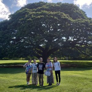 娘の結婚式のため親族9名でハワイに行きました。全員でオアフ島一周のツアーにも参加しましたが、年寄りと若者が行きたい処が分かれるため、年寄り6人でバン貸切観光チャーターを日本から予約しました。オアフ島一周ツアーで行けなかった処(真珠湾、イオラニ宮殿、カメハメハ大王像、出雲大社)を回りました。真珠湾ではアリゾナ記念館と太平洋航空博物館の順番を適切にアドバイスして下さり殆ど待ち時間なく効率的に回ることが出来ました。昼食の当てが全く無かったので相談したら、海近くのローカルの人達も行くという店に案内して下さり、マグロ丼(正式名称は?)を食べました。とても美味しかったです。有難うございました。