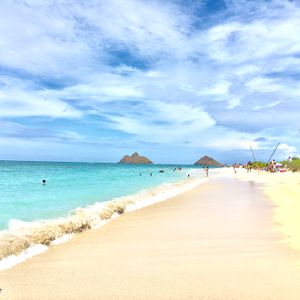 午前中だったため、ハレイワの街も空いていて写真スポットもシェイブアイスも並ばず楽しめて、ショッピングを楽しんでる間にソノミさんがワウワウレモネードをゲットしてくれて、カマロンとジョバンニのガーリックシュリンプを食べ比べさせてくれて地元の美味しいビールまで用意してくれるサービス!ホントありがたかったです。お腹を満たしてからカイルア方面へ、その時には天気も回復し、レンタサイクルを借りてラニカイに行くつもりが1軒目の自転車屋は10歳以上しか乗れない自転車で下の子が乗れず、2軒目で3人乗り電動アシスト付き自転車を借りることに成功。坂道も楽々スイスイでした。その時の対応もソノミさんのおかげでスムーズに。念願のラニカイピルボックスとラニカイビーチで存分に遊び3時のおやつのように、ソノミさんがブーキモのパンケーキをテイクアウトしてくれてたのでそちらをいただき少しお買い物してからホテルへと送っていただきました。
