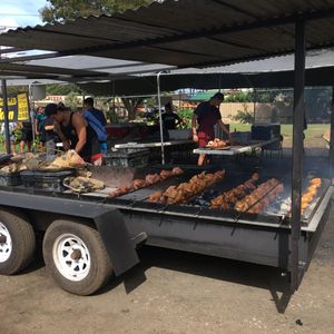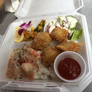 ハワイのローカル食を昼食にという希望も聞いてくださり バン販売 ガーリックシュリンプの ランチを ハイビスカスの花の下のベンチ で頂きました !あいにく少し小雨でしたが マチュアな女性4人が 少女のように なりました !!