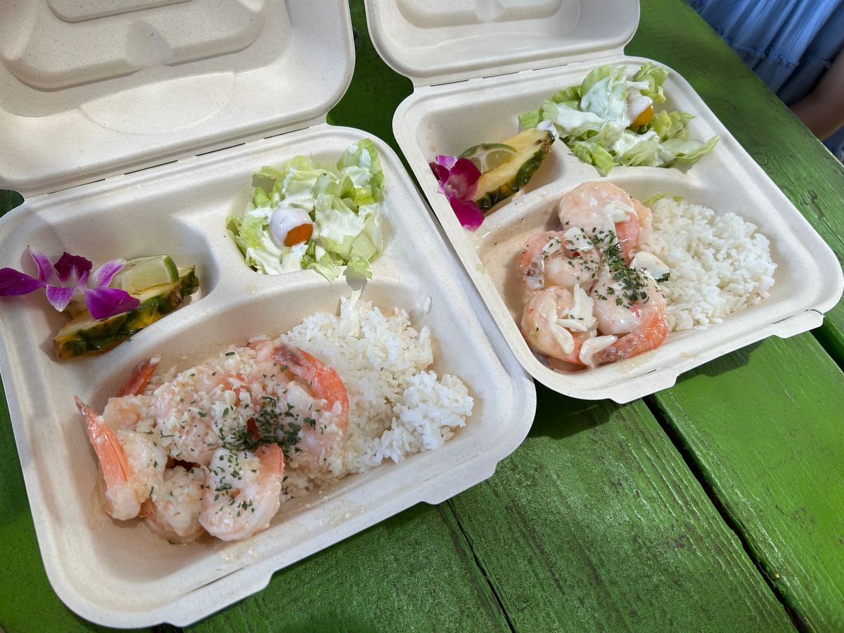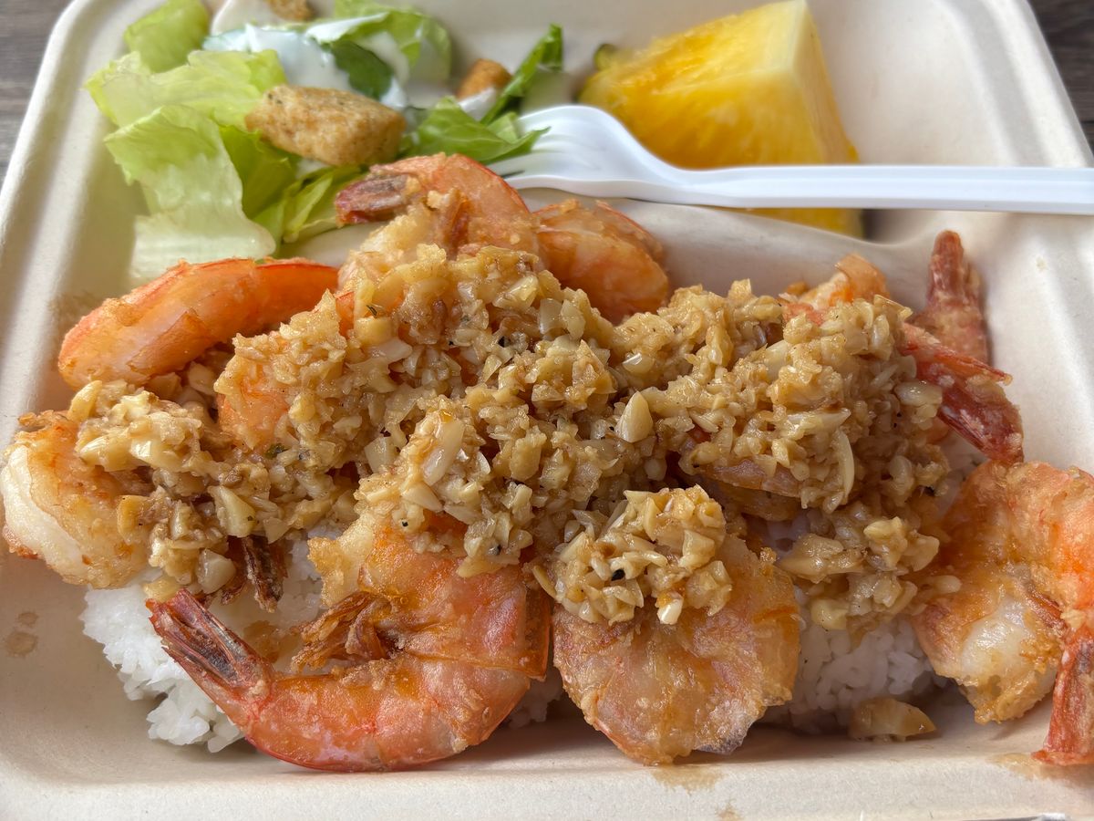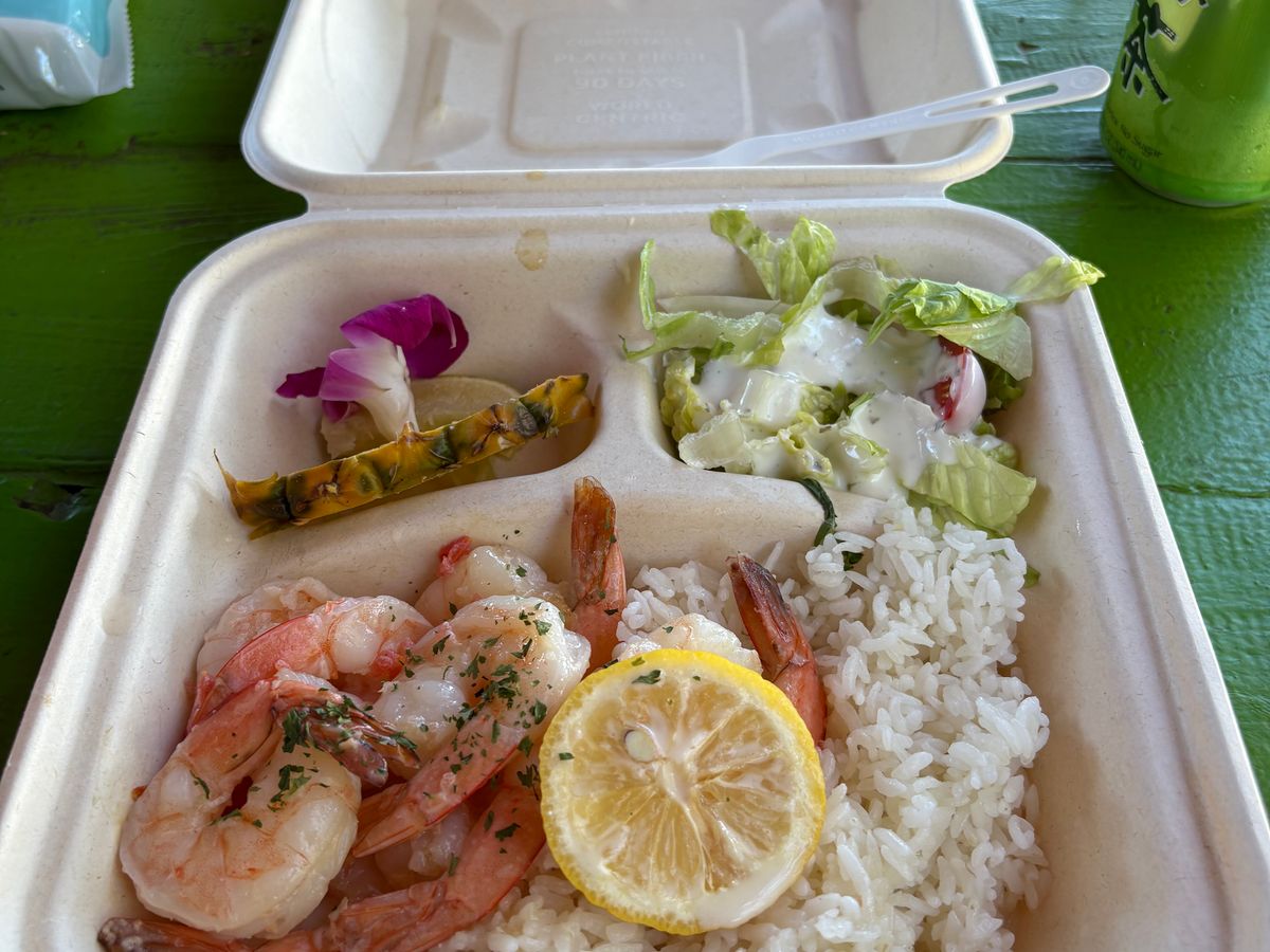 おすすめのガーリックシュリンプを用意してもらい、木陰で食べました。とってもおいしかったです。場所の案内だけでなく、ハワイの歴史などについても教えてもらえて、とても充実した時間でした。