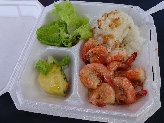 内容は、ガーリック味のえびのから揚げ、ライス、パイナップル一切れ、レタス、これがワンパックになったプレートランチです。予想に反してこれがおいしいのなんの。