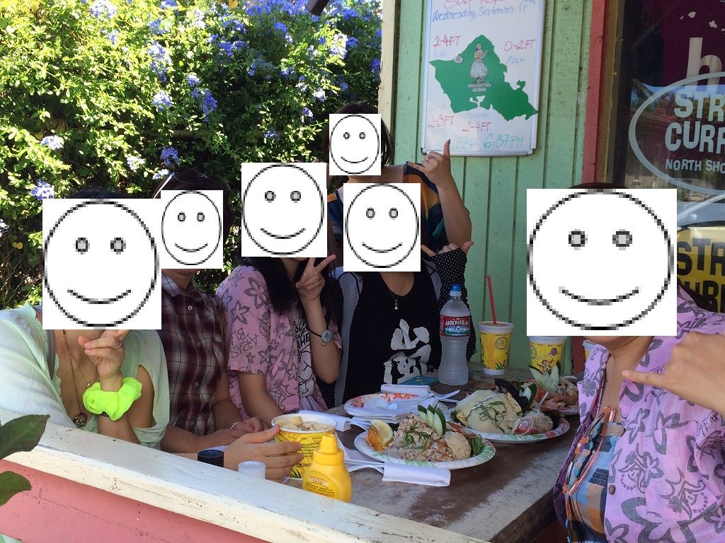 コースは潮吹き岩→ワイナマロビーチ→フランキーズナーセリーの白いパイナップル→ブーキモのパンケーキ→ドールプランテーションでパイナップルソフト→アリービーチでうめがめと写真→ソープファクトリーとコーヒー工場→マッキーズのガーリックシュリンプ→ハレイワを散策→ワイケレアウトレットでお買い物→レナーズのマラサダ→この木なんの木をまわりました。パンケーキやガーリックシュリンプは、事前に電話をしてくださり、待ち時間がほとんどない状態で効率よくまわることができました。
