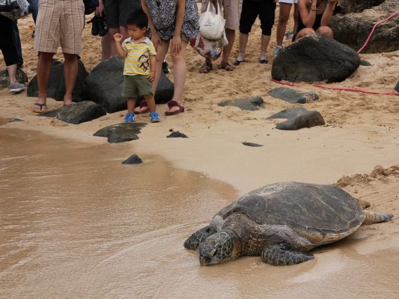 ラニアケアビーチは、ちょうどカメさんが海に戻るところに遭遇できて、1歳の息子も大喜びでした。