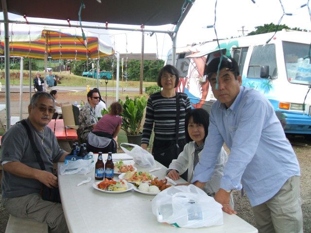 尚、ノースショアではMalamaマーケットでビールをゲットししている間に隣で焼いてるフリフリチキン(土曜日限定)を買ってもらい・エビの屋台(ジョバンニ)に持ち込み、エビの唐揚げ弁当で昼食、元祖アオキ屋のシェイブアイス(レインボーカラー)でデザートと、本当に細やかな心配りで私達を楽しましていただきました。多くの記念写真を撮っていただき、非常に楽しい時間を過ごさせていただきました。最後は時間超過でも嫌な顔もせず、途中買い物のために荷物をホテルに届けていただき、アラワイショッピングセンターでは帰りのバスターミナルでの乗車の仕方まで教えていただき、至れり尽くせりでした。本当に有難う御座いました。