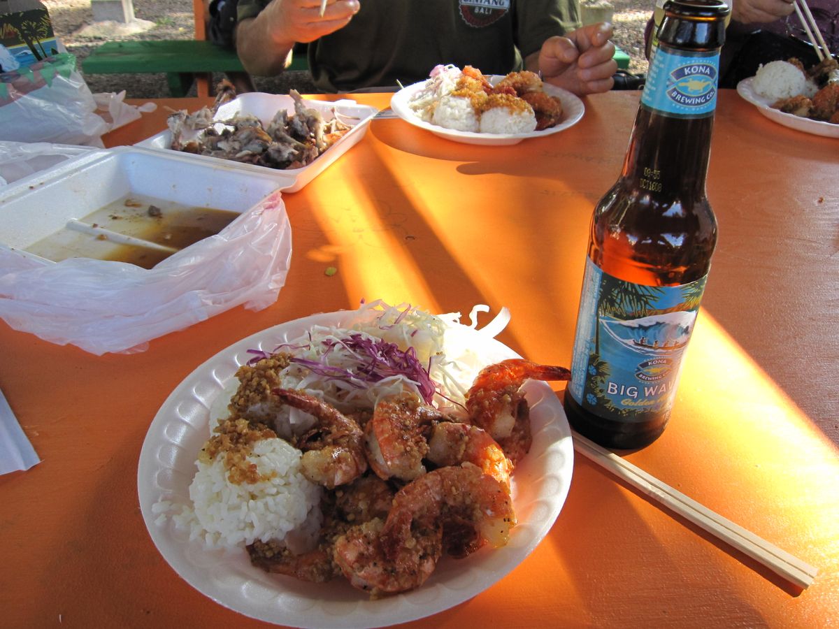 行く機会がもてず・・バン一日チャーターをお願いしました。AM8:00ホテルを出発!明るく、フレンドリーなソノミさんの案内です。朝市ではジンジャーエールとフライドトマトを味見!その後パリHWを抜け東海岸周りでノースへ・・ブーツ&キモズのパンケーキをテイクアウトしてカイルアビーチ散策、チャイナマンズハット、ライオン岩を眺めマカデミアナッツのおいしいお店でお土産を買いカフクへ..ロミーズでえびのランチプレート!やっぱりBEERにピッタリでした。レンタカーだと飲めなかったな~