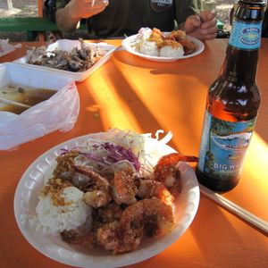 行く機会がもてず・・バン一日チャーターをお願いしました。AM8:00ホテルを出発!明るく、フレンドリーなソノミさんの案内です。朝市ではジンジャーエールとフライドトマトを味見!その後パリHWを抜け東海岸周りでノースへ・・ブーツ&キモズのパンケーキをテイクアウトしてカイルアビーチ散策、チャイナマンズハット、ライオン岩を眺めマカデミアナッツのおいしいお店でお土産を買いカフクへ..ロミーズでえびのランチプレート!やっぱりBEERにピッタリでした。レンタカーだと飲めなかったな~