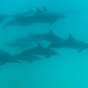 出港してすぐにイルカの群れと出会いました。結構体育会系で、45分間ほど海で泳ぎ、のべ50匹近くを数mの距離で見られたと思います。