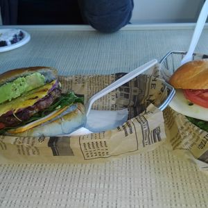 お昼のチーズバーガーはお肉がかなりボリュ-ムあり。パイナップルも甘くておいしかったです!