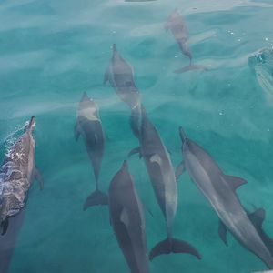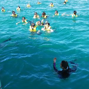 泳げないので、最初は海に入らず船の上から見てようかと思いましたが、思い切って海に入って少し移動すると、下を見てーと言われ下を見たら、すぐそばにイルカがたくさんいて、とても感動しました。