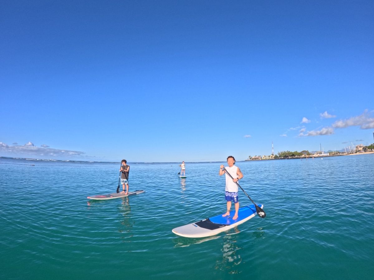 アラモアナビーチによるサップを体験しました。集合場所など不安要素がありましたが、LINEでの対応をしていただき、無事体験することができました。ザバスで目の前に止まるのでおすすめです。レッスンは砂浜でおおよその型を学び、すぐに実践に移りました。私も彼女も不安がありましたが、すぐに慣れました。また、基本日本語でインストラクトしていただけるので英語が不安な方も安心です。ウミガメを近くで見ることができ、彼女も私も大喜びでした。フレンドリーなお二人に感謝申し上げます!