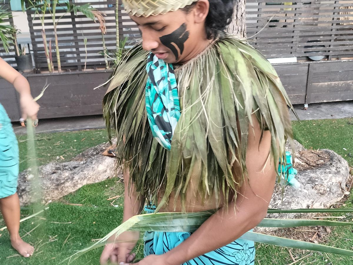 席はステージ前席といいながら結構後方でステージまでちょっと距離があり残念な感じでした。食事後にアクティビティに参加できるということだったのですが、ほとんど時間がなく、お兄さんにヤシの葉の冠を作ってもらった程度でした(自分で作れるハズだったんですけどね)。