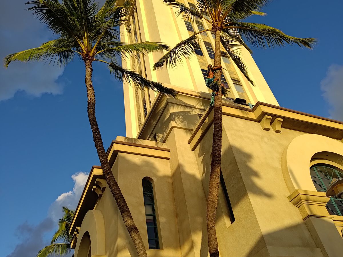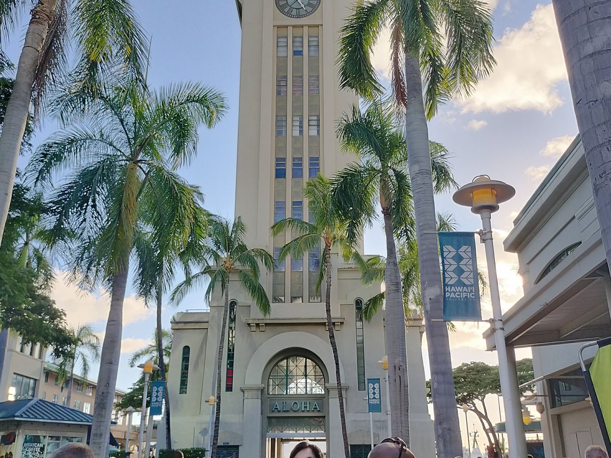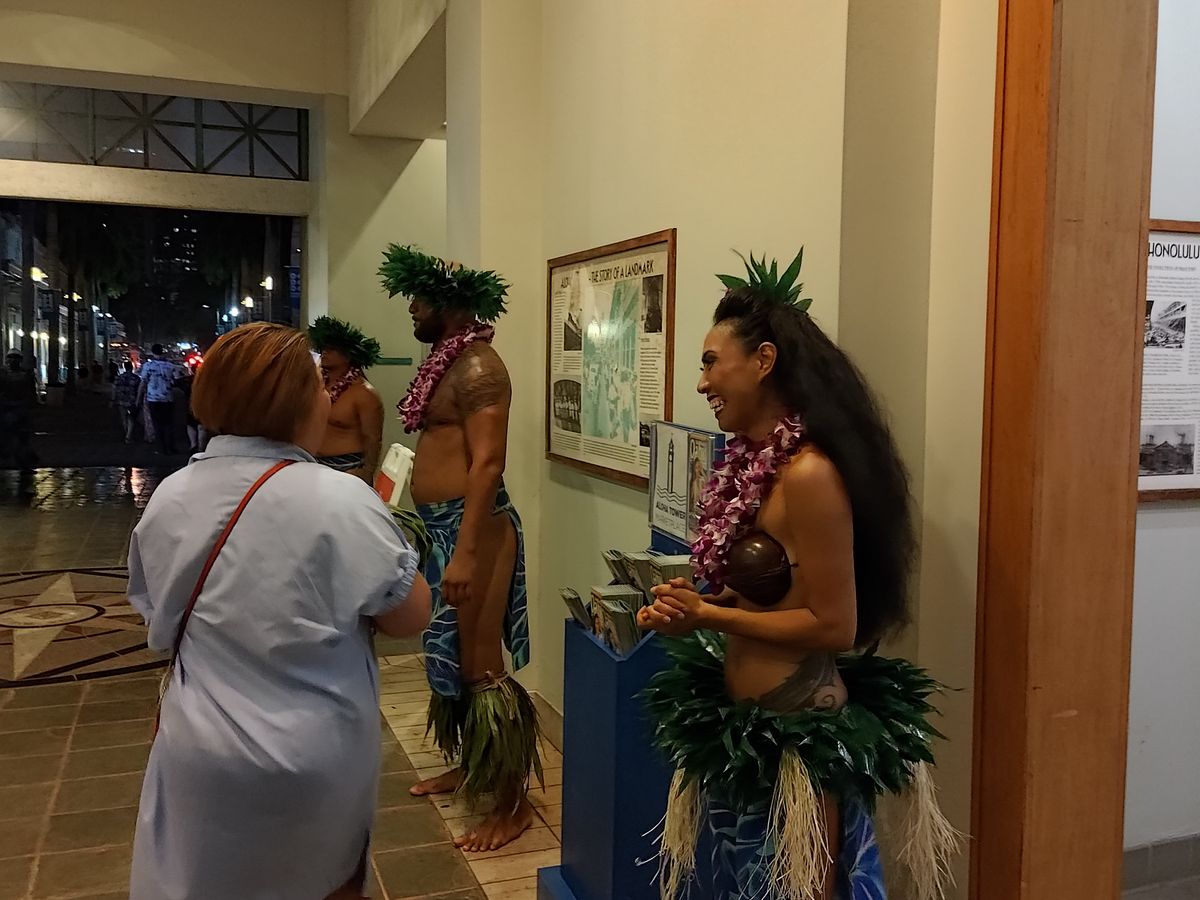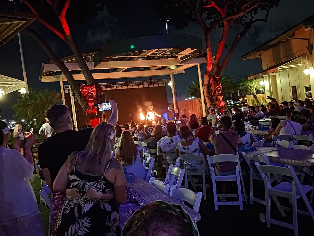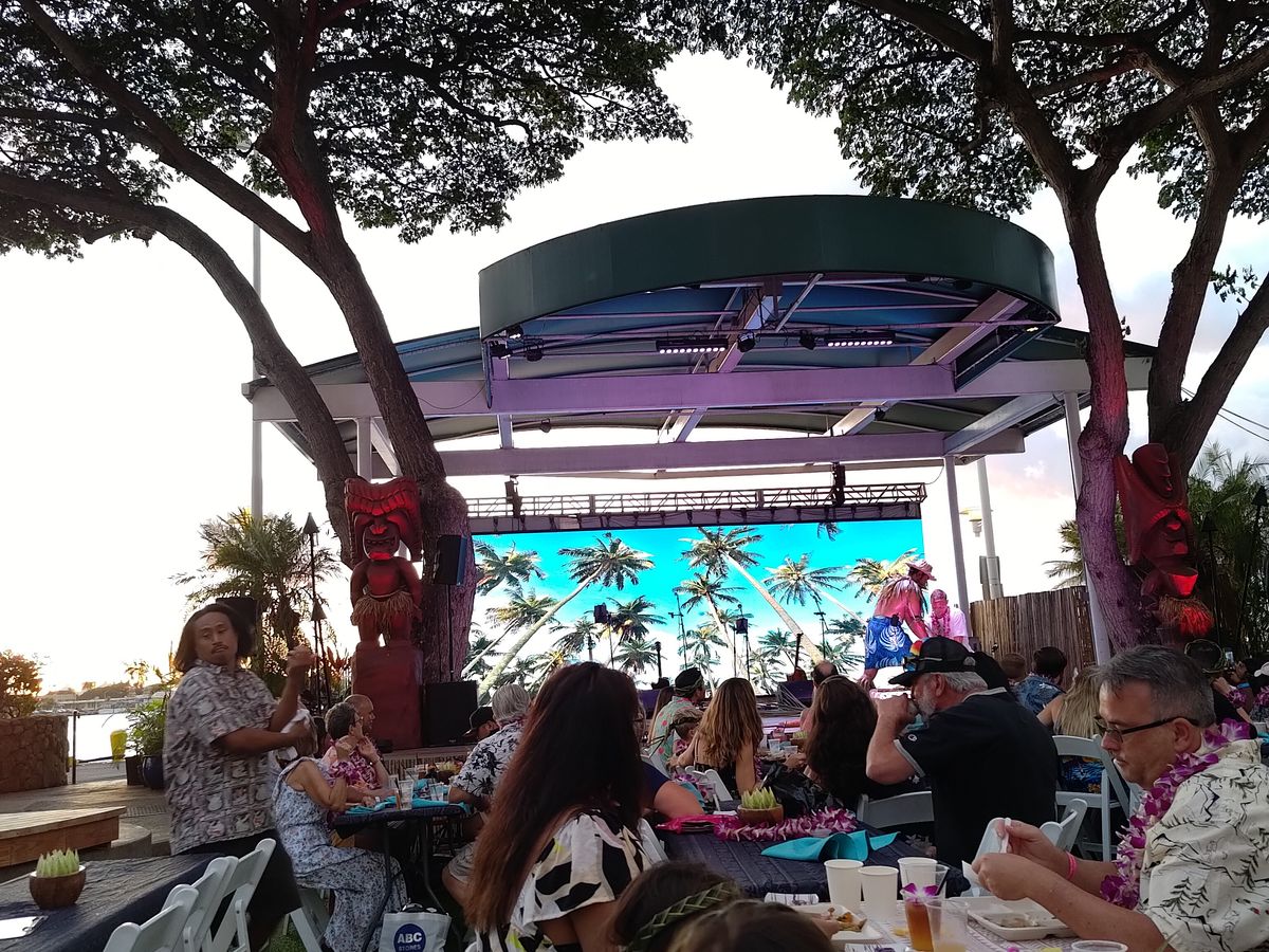 会場はアロハタワーのすぐ横。到着するとレイを掛けてもらって記念撮影(のちほど1枚 30ドルほどで購入可能)。その後、席についたら、プレートが配膳されて食事スタート。セレブリティプランだったので、自分で取りに行かなくても良いのは良かったんですが、メニューは今ひとつな感じ。前に座っていた年配の米国インディアナポリスから来たと言っていた夫婦は、どうやら気に入らなかったらしく、結構残した上、途中で席を立って戻ってこず。多分、そのまま帰ってしまった感じでした。