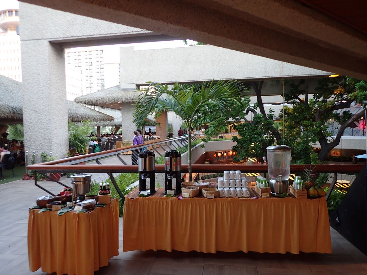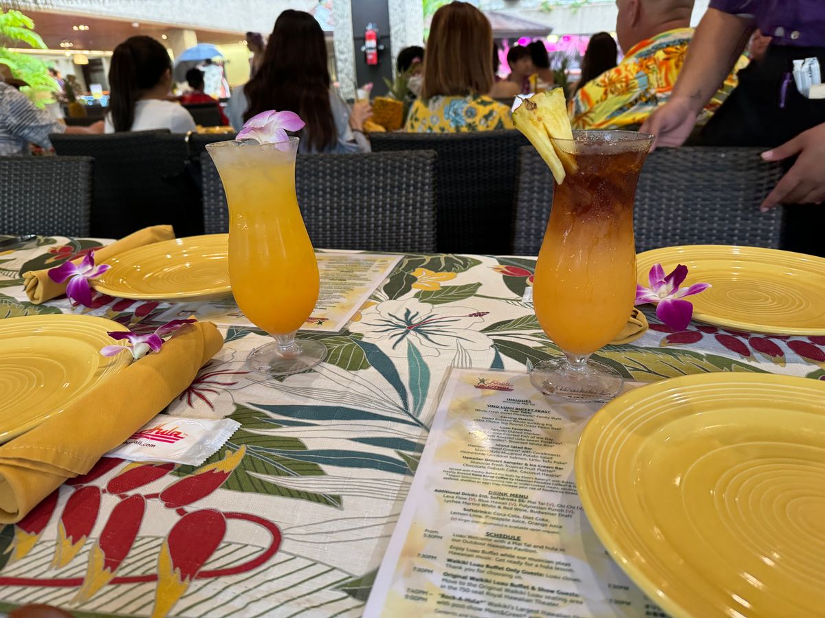 まずはディナービュッフェについて、食べるところはオープンテラスで夜風が心地よく、テーブルにつくと、髪飾り用に生のデンファレの花が用意されておりハワイの飲み物を飲みながら気分はハッピー