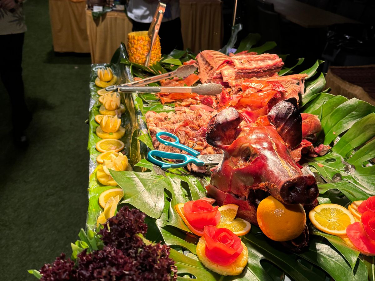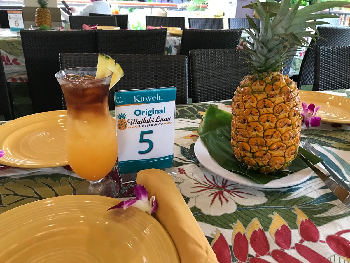 ビュッフェ形式のお食事は、ハワイらしいメニューになっており、意外と滞在中に口にする機会のなさそうなものを頂くことができ、嬉しかったです。また、まるごとのパイナップルや、ウェルカムドリンクでマイタイのサービスなどもあり、とても楽しめました。また、お食事中にフラダンスを間近で見ることができ、貴重な時間でした。新婚旅行で伺いましたが、席ごとにウクレレの演奏もしていただき、嬉しかったです。
