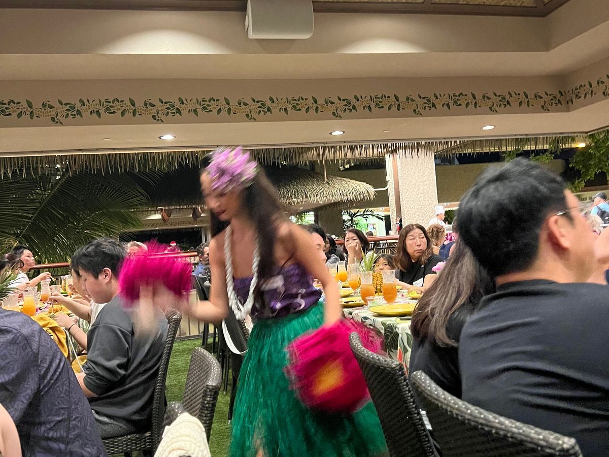まずは夕食ブッフェ。おしゃれなハワイのカクテルなどに始まり、ローストビーフ、ポークなど一通り食べたらお腹がいっぱいになりましたが、デザートもしっかりいただきました。食事中もテーブルの間でフラダンスやウクレレなどのミニショーがあり、ハワイらしい雰囲気を味わえました。