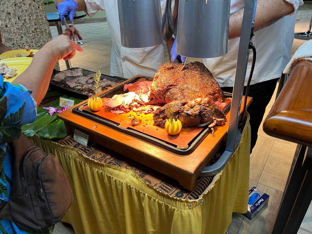 ダイニングエリアと劇場は同じフロア、ショッピングモールの4階にあります。ワイキキビーチにもとても近く、私たちのホテルから歩いて行けるのでとても便利です。ビュッフェにはウベパン、サラダ、魚のフィレ、蒸しウベとヤム、パスタ、BBQビーフなどがあり、素晴らしい料理は豚肉と伝統的なハワイのカルアピッグです。シェフが豚を切り分けてくれました。カリカリの豚の皮は本当に美味しいです。大好きです。そしてココナッツプディングも美味しいです。ディナーの後、ショーを観ました。伝統的なハワイのダンスに関するショーだと思っていましたが、エルビス・アーロン・プレスリーやマイケル・ジャクソンの音楽もありました。歌手たちは素晴らしいです。ショーも大好きです。