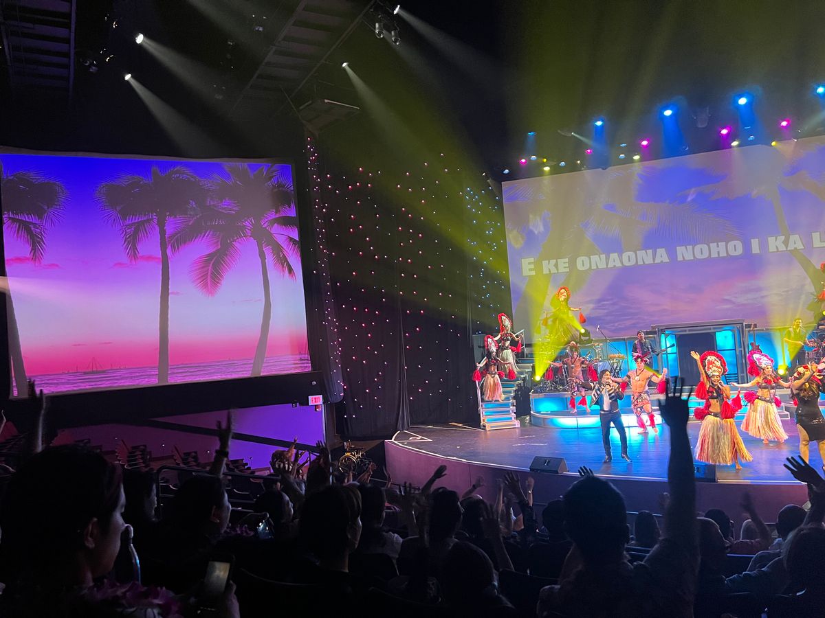 Theme of the show was how the music evolved around hawaii from 1920 to 2000.It was wonderful transition between different eras. Actors were very talented and sound quality was too good. I felt like I am listening to live original songs.Fireshow was amazing, very creative.I liked how they had catered to all different generations and brought a mix of everything. I did not even realize how time went by and enjoyed each moment of the show.After the show there was meet and greet activity at Lobby. Please spend some time taking pictures with them and appreciating their work. After the show , they also have bar with live musical with happy hour. I enjoyed some drinks at the bar. Definetly don't miss out on that, blue hawaii is the best !