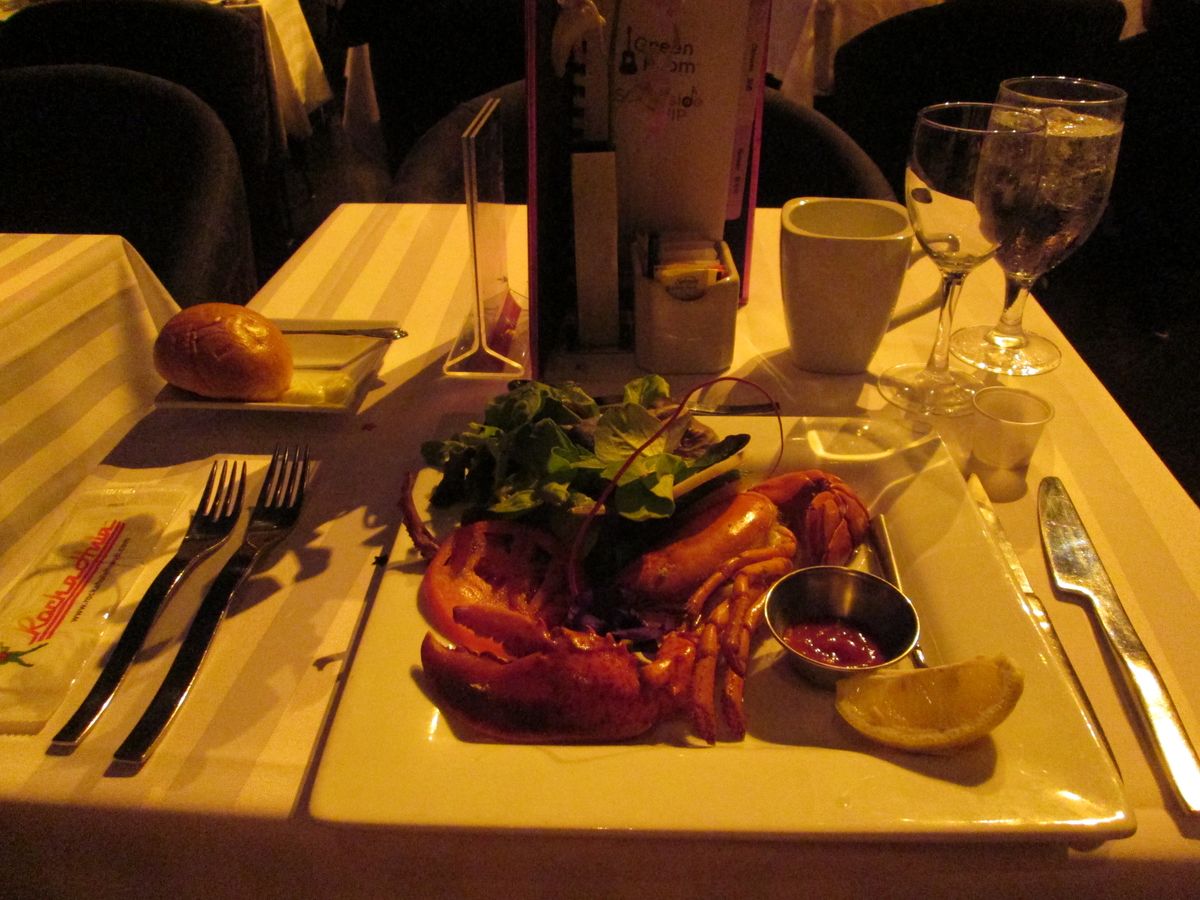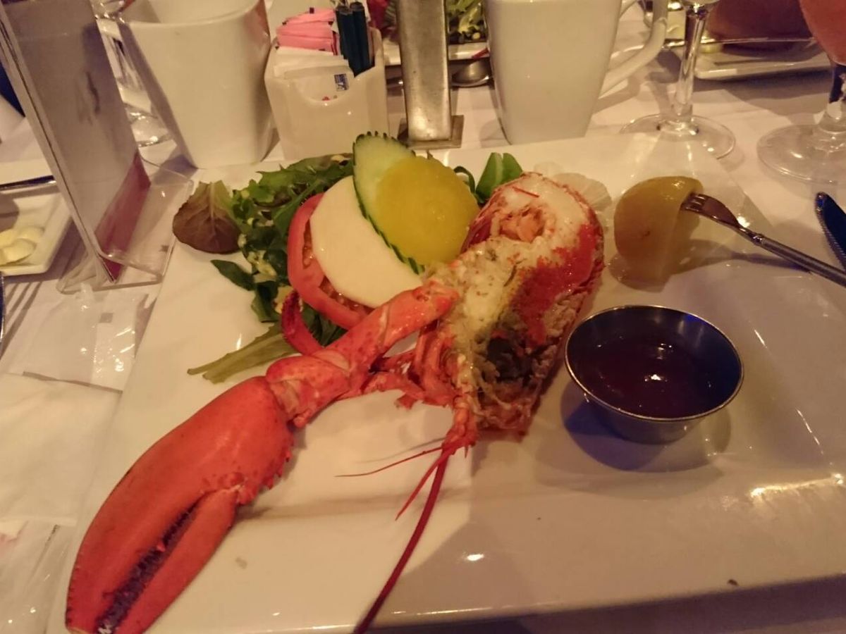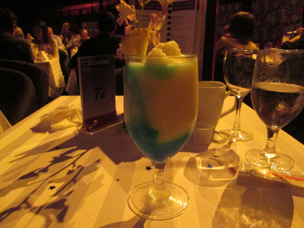 ディナーはステージの前に設けられたテーブル。料理はロブスターとステーキですごく美味しいわけではないが無難な味だった。アルコールは1杯だけ無料でその後は有料。ブルーハワイを頼んだら10ドルだった。