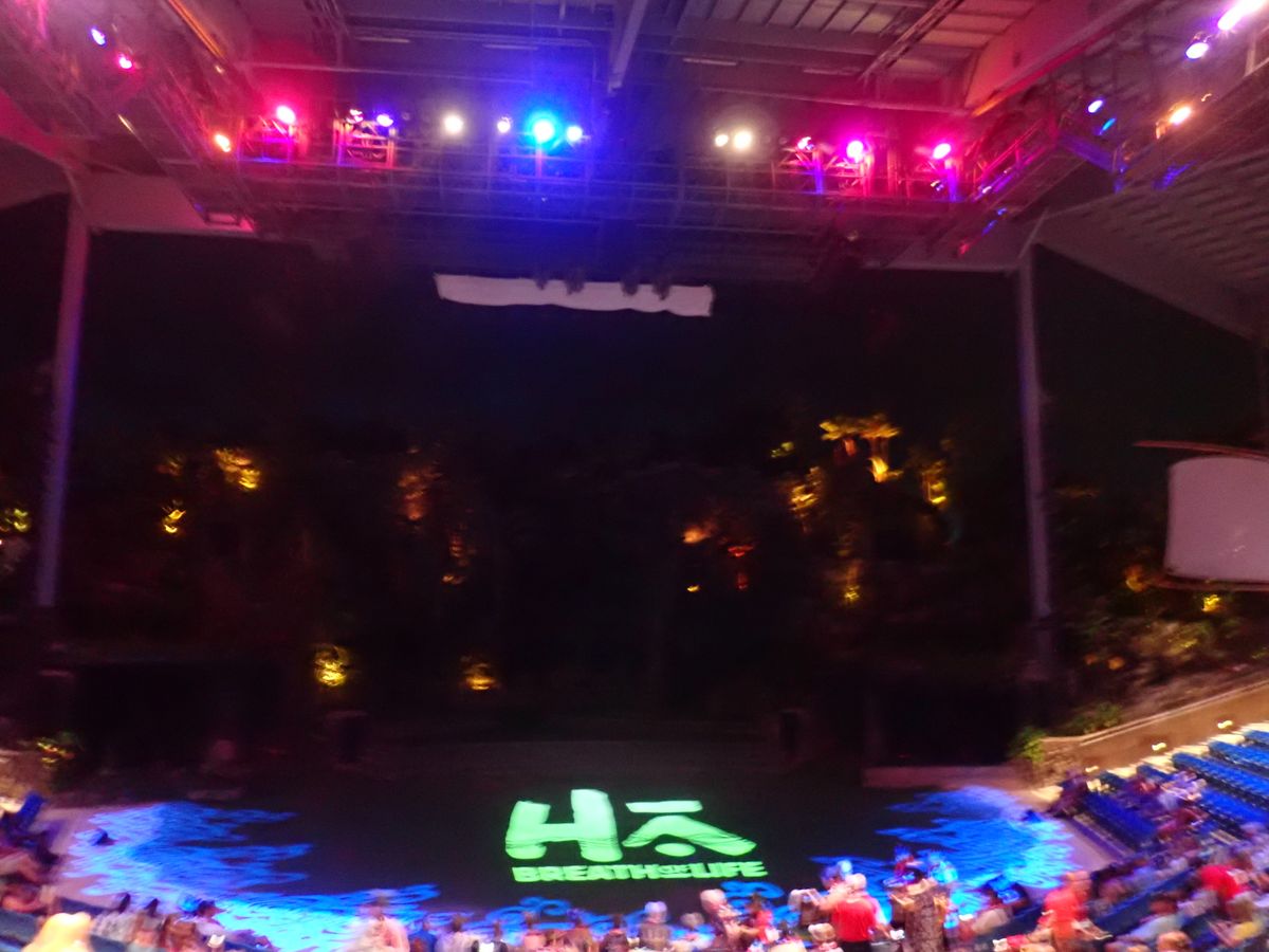 食事が終わって、シアターに案内されました。座席は、2階の最前列でした。これもこのツアーの特典なのかなと思いました。1階では、豪華な食事をしている人たちの食事がまだ終わっていませんでした。私は、オープンエアのテラス席で開放的な雰囲気で食事ができてよかったと思いました。また、2階席だったので、ステージ全体が見渡せたのでよかったです。