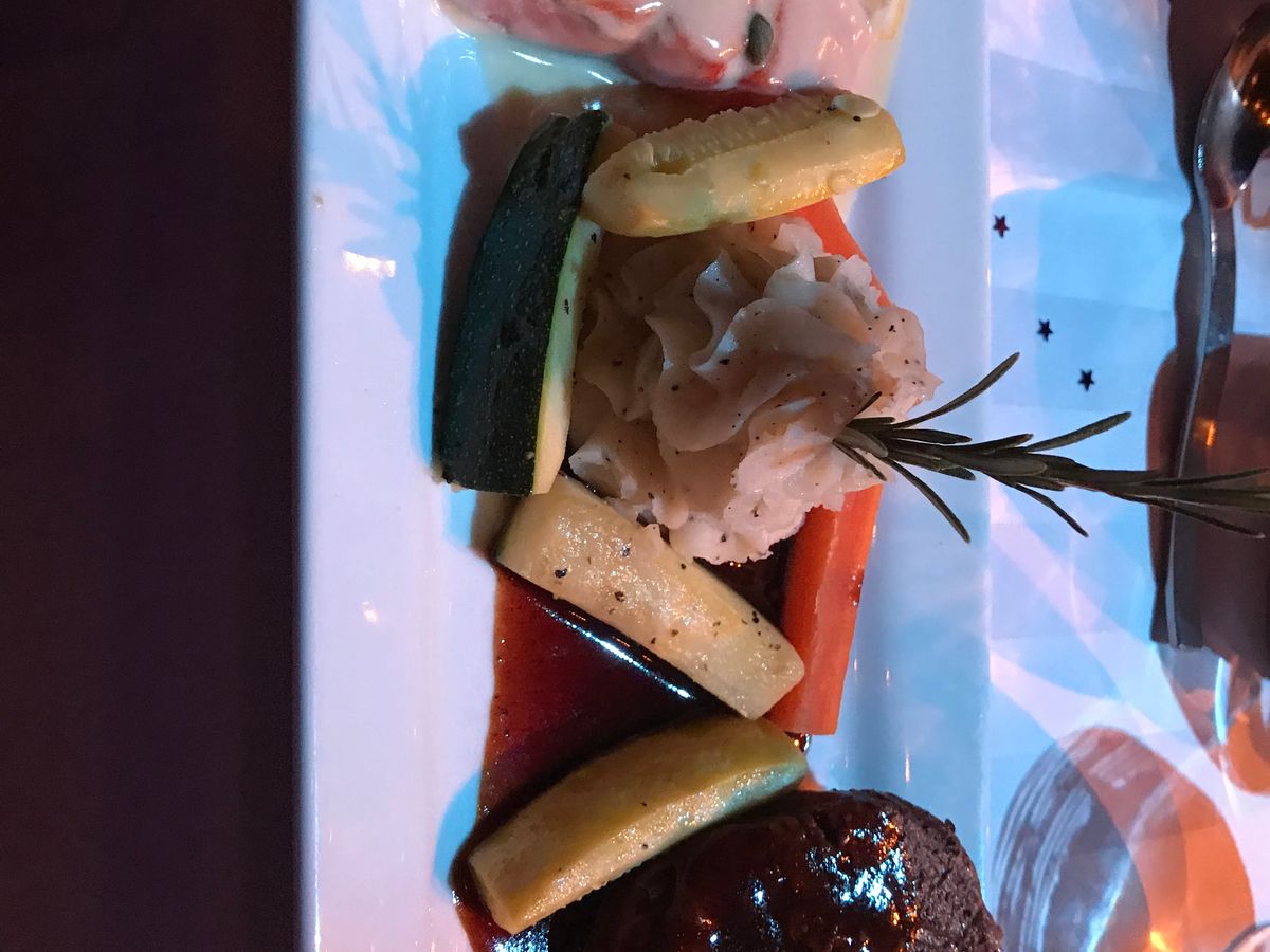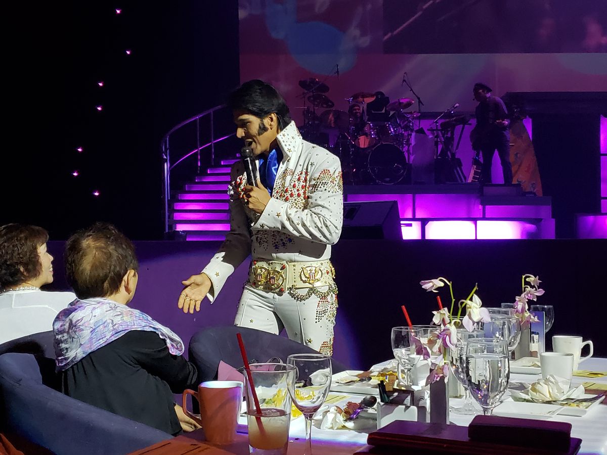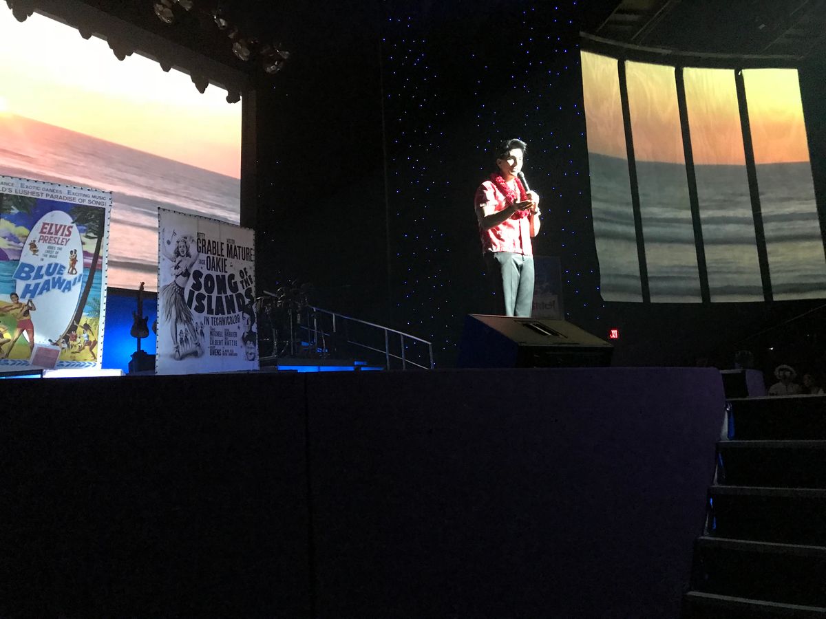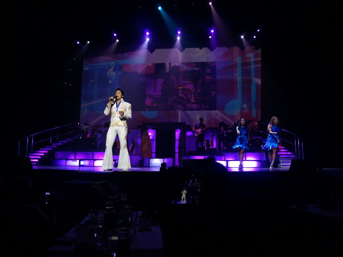 到着したとき、私たちを迎えるために伝統的なハワイのダンスがありました。その後、前菜を楽しむために会場に入りましたが、前菜は美しく盛り付けられ、とても美味しかったです。メインステージエリアに入ると、私たちの席の位置に驚きました。ステージの真ん前でした。食事は素晴らしく、4コースすべてが完璧に調理されていました。ショーが始まると、制作は素晴らしかったです。ブロードウェイのショーのように振り付けされていました。エルビスのものまねをするパフォーマーは素晴らしい声で、本当にその役にぴったりでした。「サスペiciousマインズ」の間に観客の中を歩きながら、歌詞の合間に笑っていて、エルビスがライブパフォーマンスでやっていたように見えました。シンプルな演出ですが、細部への素晴らしい配慮です。また、マイケル・ジャクソンのパフォーマーも非常に良く、楽しませてくれました。彼の「ムーンウォーク」のルーチンは完璧でした。