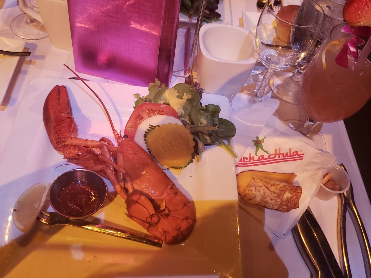ディナーは、メインのロブスターにサーモン、ステーキ、サラダ等どれも程良い量で美味しく戴きました。席の移動もなくドリンクを飲みながらショーを拝見。エルビス、マイケル両そっくりさんと女性ボーカルは歌もパフォーマンスもうまく、ダンサーとのフラダンス、ロックンロールのコラボは魅力たっぷりで大満足。