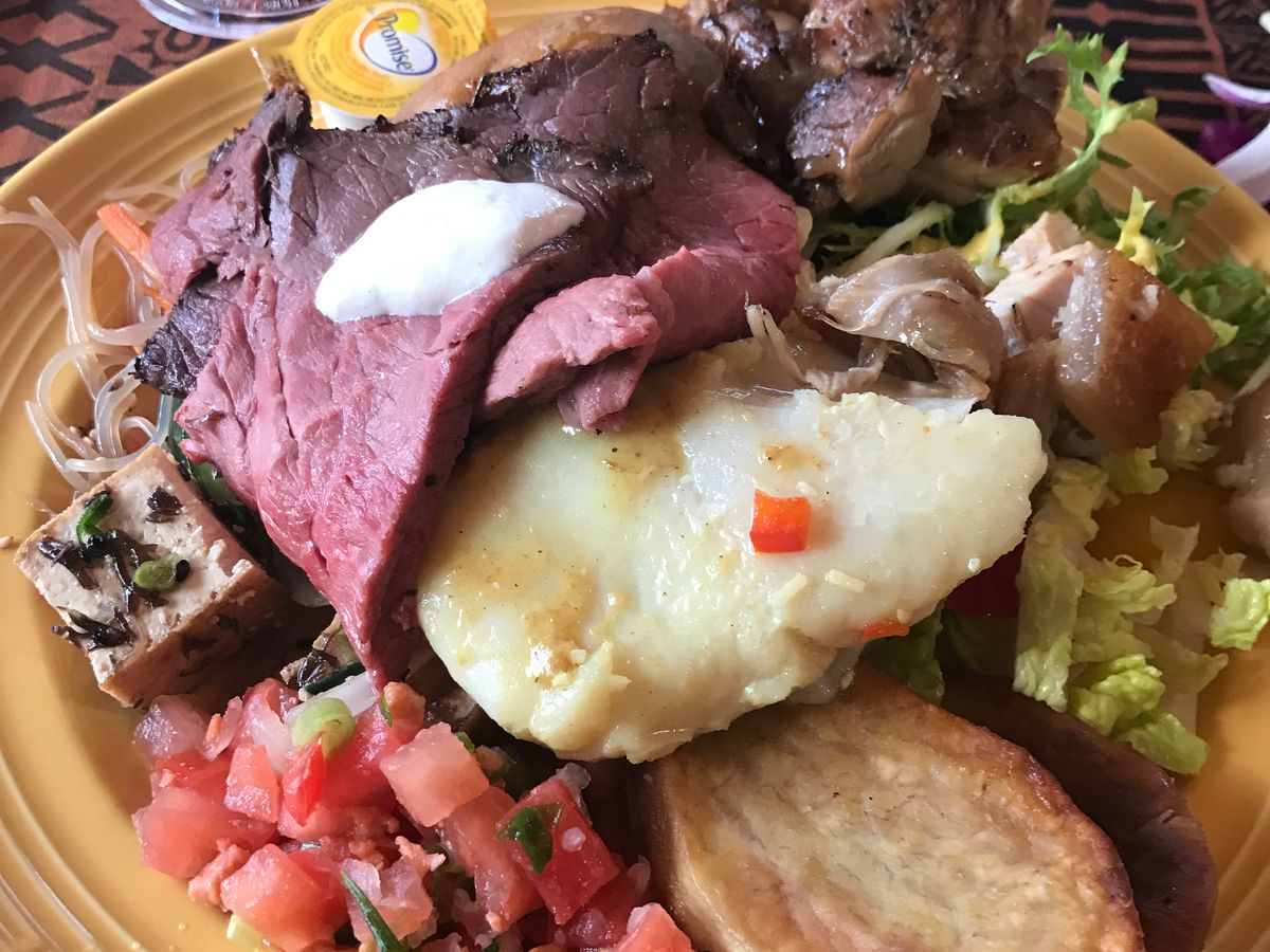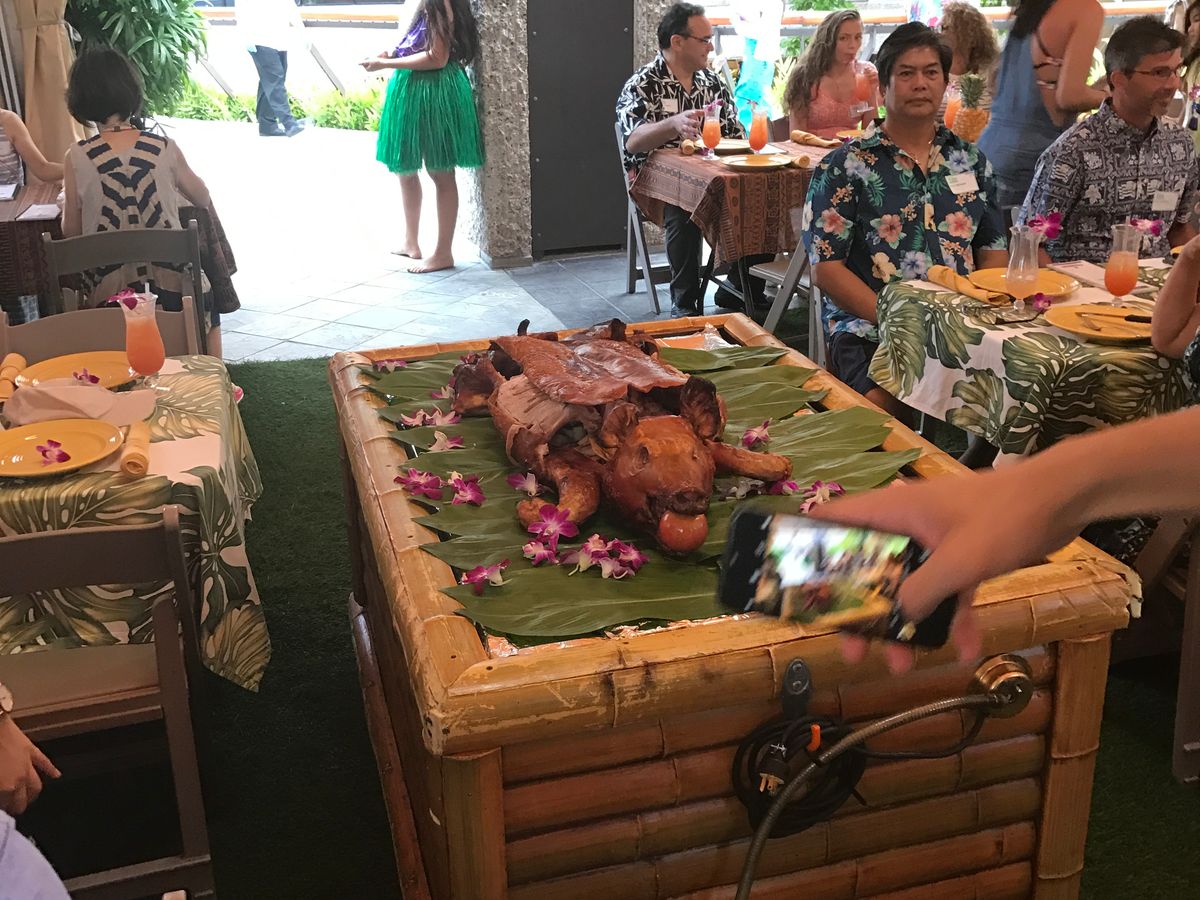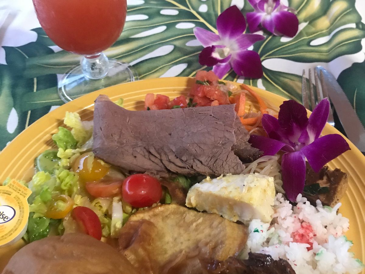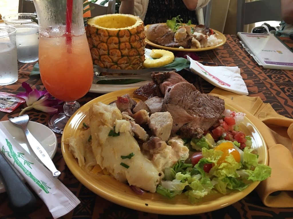 夕食のメニューはフリカケライス、フリフリチキン、タロイモのスイートポテト、豚の丸焼きなど、ハワイのローカル食が中心です。飲み物はマイタイが1ドリンク付いていて、大人はアルコール入りを選べ、子供にはノンアルコールのものが出ました。