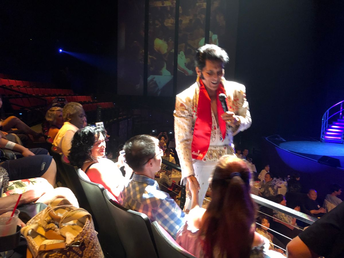 ブッフェが終わるとショーの会場へ移動。こちらは並び順なので早く並べば早く会場に入れます。私達はプレスリーファンの夫がこのショーを楽しみにしていたので早めに並びました。