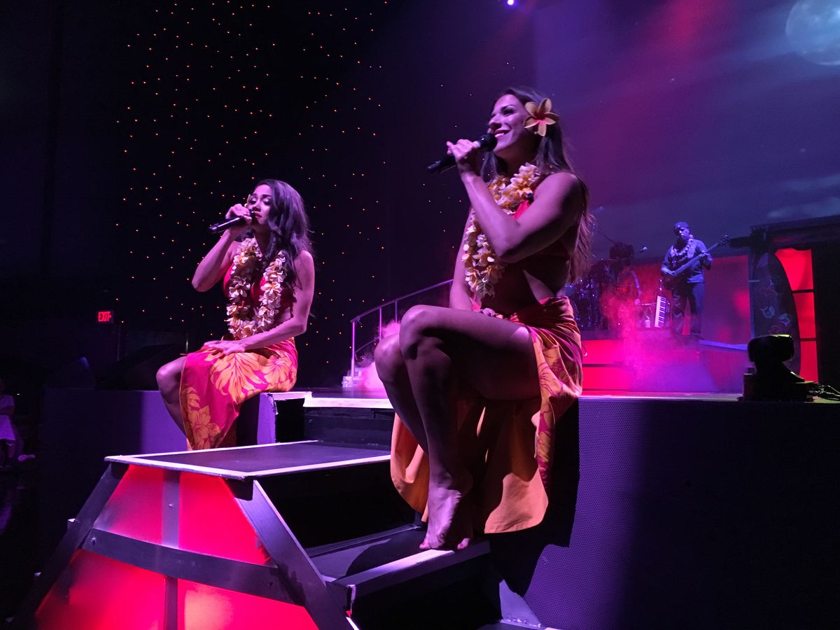 最初にバフェで食事をしますが、簡単なフラダンスショーがあります。お客さんも一緒に踊ったりして盛りあげてもらえます。食事も美味しかった。ローストビーフの切り分けや、デザートのシャーベットがGood.小さな子供には宝探しゲームもあった。ショーは生演奏で特に女性歌手の歌声がよかった。おすすめです。