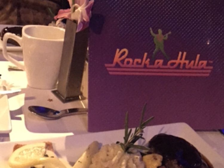 今回参加したロック・ア・フラショーは大変贅沢で楽しいひとときでした。まずは受付でバックステージパスカードを受け取り首から下げ他のお客様より先に会場の中へ。ちょっと優越感!煌びやかで素敵なお部屋に通されシャンパン(私達はノンアルコールシャンパン)と南国チックなアペタイザーを頂きながらVIPな気分も味わいました。その後、エルビスやダンサーが着る衣裳部屋をのぞかせてもらったり実際に使う道具を触らせてもらったり写真も撮りながら楽しみました。ステージにも立ちちょっと興奮(笑)だんだん気分も盛り上がりディナータイムへ。コース料理はどれも豪華で美味しかったです。特に私が気にいったのはトリュフ入りのマッシュポテト。今まで食べたことのない味で大満足でした。デザートまで完食してしばらくするとショーの始まり!!エルビス、マイケル、ダンサーの皆さんのパフォーマンスはさすがプロという感じで素晴らしかったです。その中でもファイヤーナイフはかなりの迫力があり一番前の席だったこともあって炎の熱さが伝わりドキドキハラハラでした。楽しい時間はあっという間に過ぎてしまいましたがとても素敵な夜を過ごすことができました。