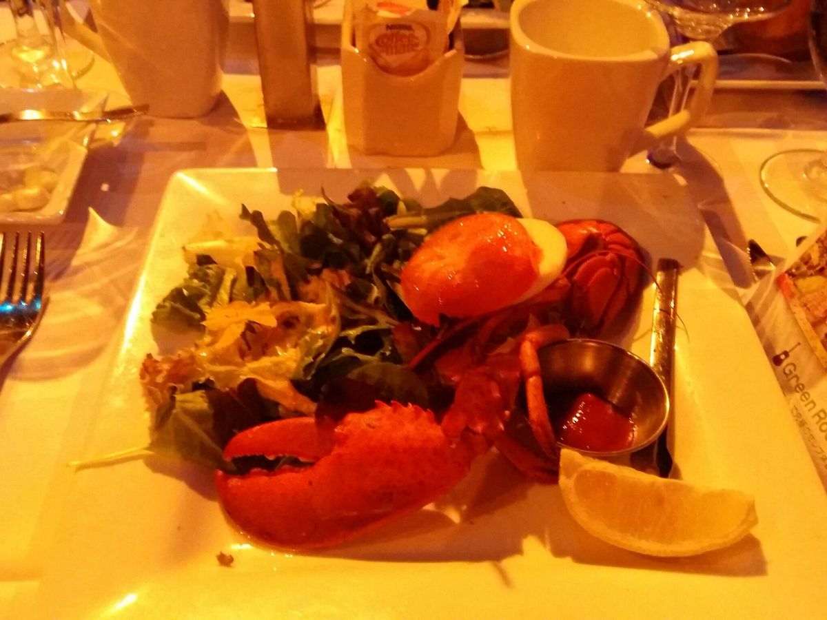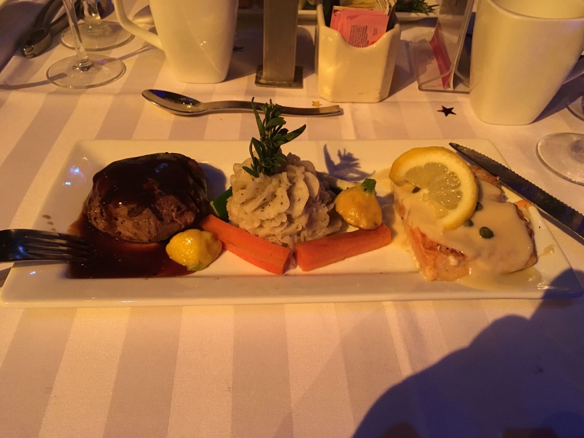 その後、ステージの前でディナーとワインをいただきました。ロブスターとステーキのディナーは素晴らしかったです。再び素晴らしいサービスでした。