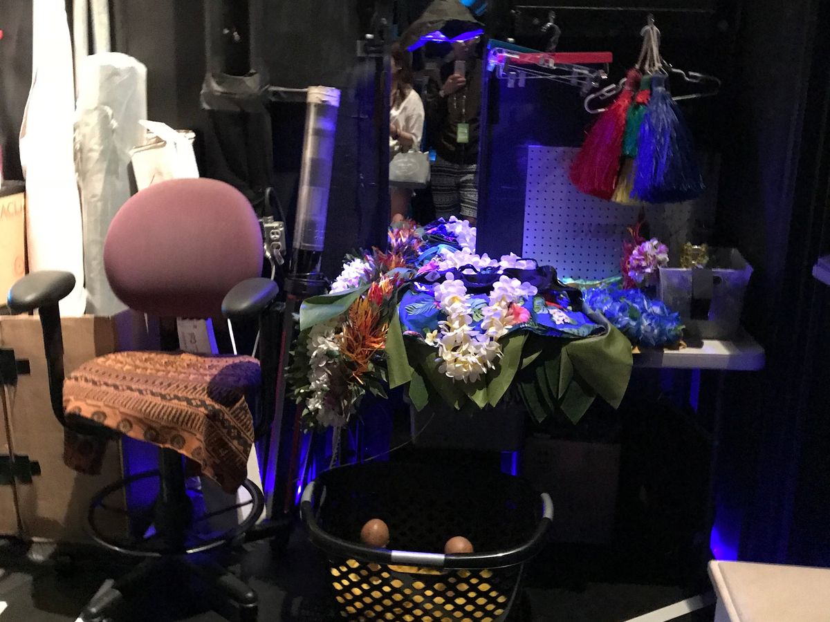 会場はホノルルの中心、ロイヤルハワイアンセンターの中なので迷うことなく到着できました。受付でバウチャーを見せるとバックステージツアーのパスを首からぶら下げてくれます。入り口ではパフォーマー達がフラで出迎えてくれます。いよいよバックステージツアーのスタートです。バックステージツアーは支配人自ら衣裳部屋や楽屋など、熱弁で説明してくれます。(英語ですが、何となく伝わってきます!)