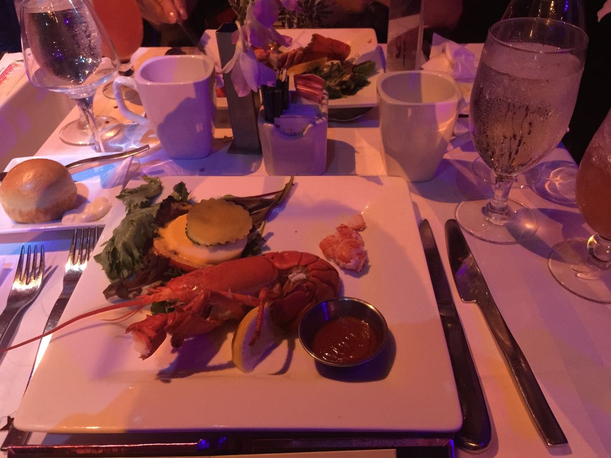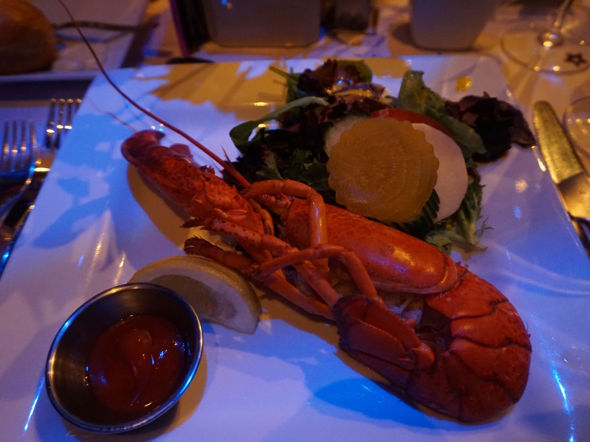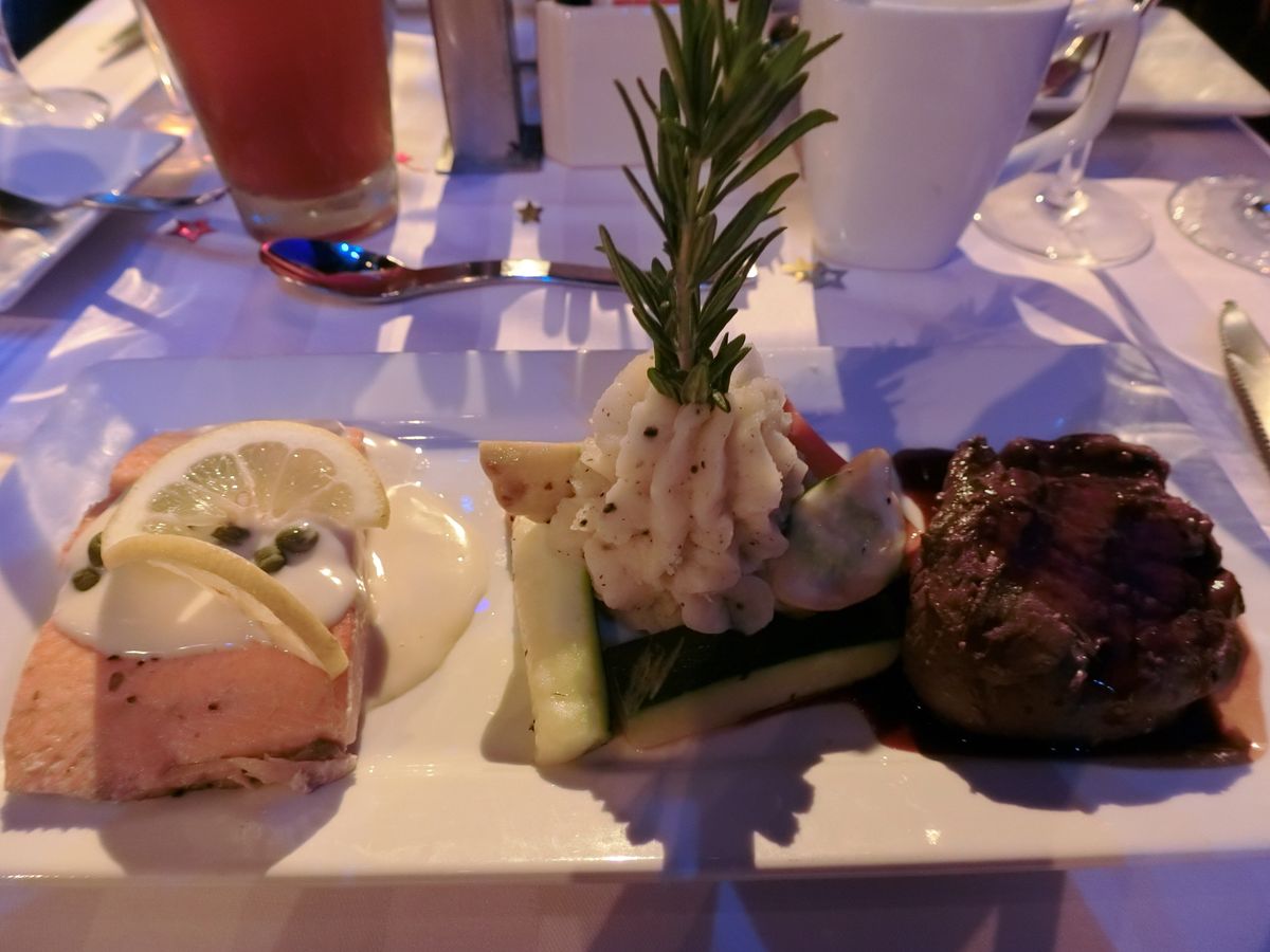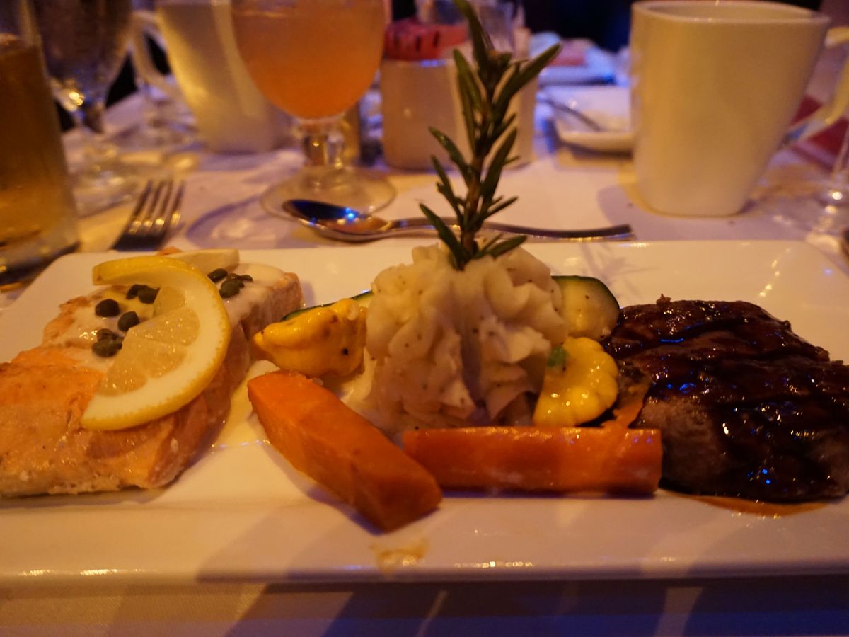 料理は5つ星です!フルーツやサラダと一緒にロブスターがやってきました。ああ、きっと結婚式で出てくるようなモソモソしたものなのだろうと想像していましたが、全くの別物でした。身がブリンと引き締まっていて(固くはないです)殻から取れやすく、おいしかったです。盛り付けも綺麗でした。また、メインのビーフ&アラスカサーモンは、料理が冷めないよう温まったお皿にのって出てきました。うれしい心遣いです。付け合わせのマッシュポテトも最高でした。全体的に量が程よく、バランスのよいお食事でした。