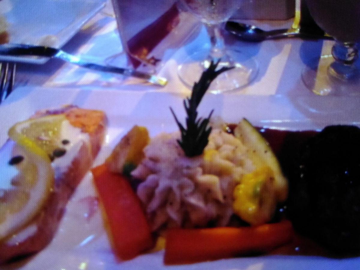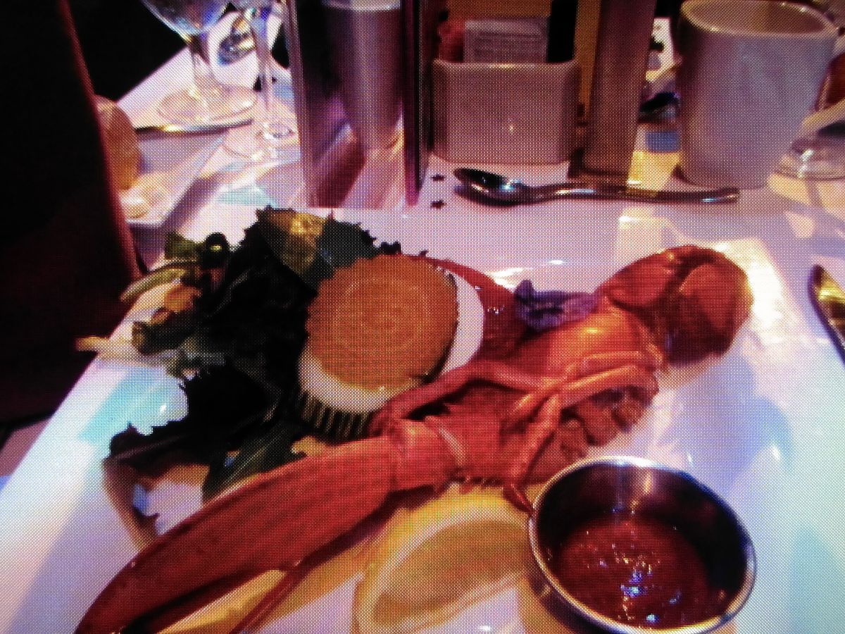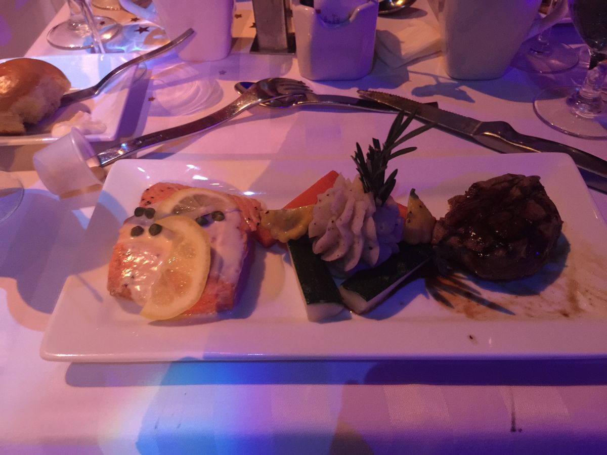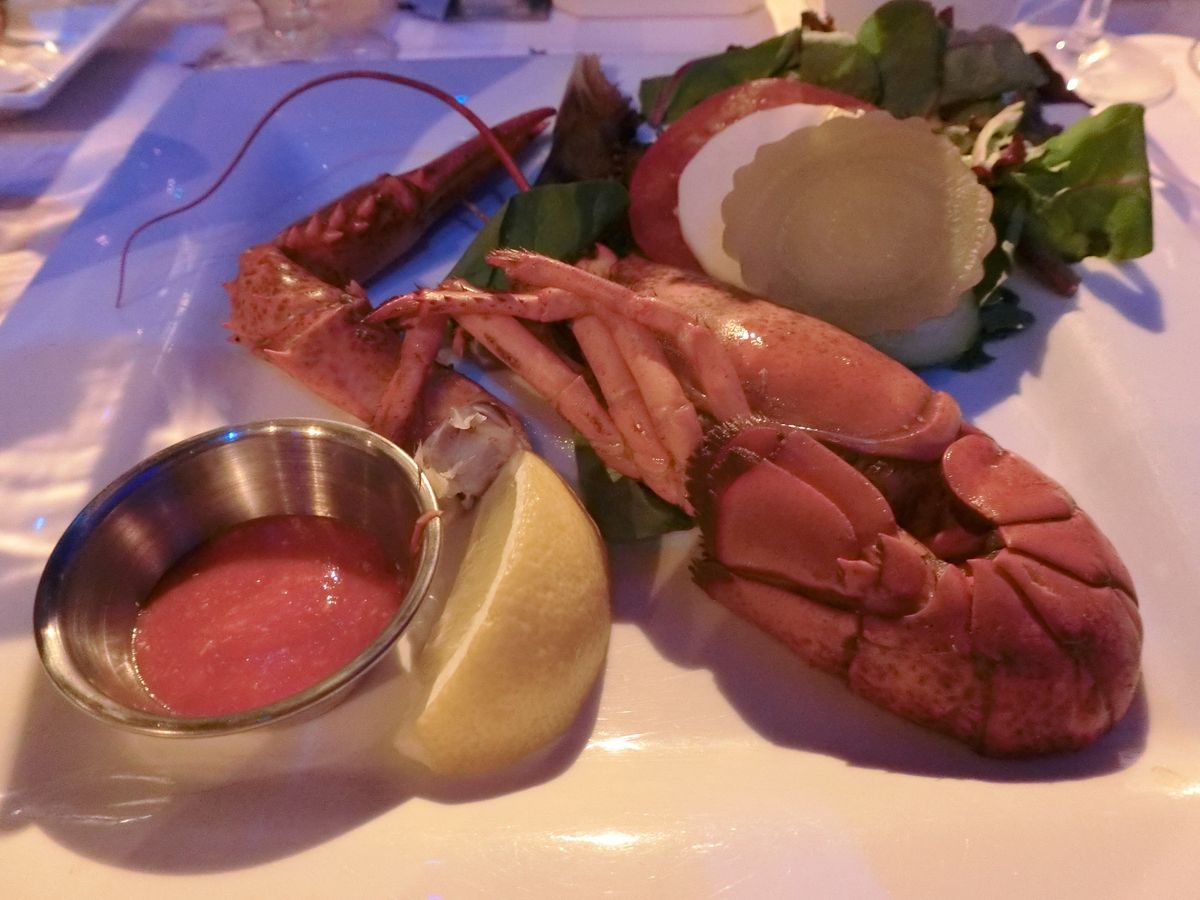 料理は5つ星です!フルーツやサラダと一緒にロブスターがやってきました。ああ、きっと結婚式で出てくるようなモソモソしたものなのだろうと想像していましたが、全くの別物でした。身がブリンと引き締まっていて(固くはないです)殻から取れやすく、おいしかったです。盛り付けも綺麗でした。また、メインのビーフ&アラスカサーモンは、料理が冷めないよう温まったお皿にのって出てきました。うれしい心遣いです。付け合わせのマッシュポテトも最高でした。全体的に量が程よく、バランスのよいお食事でした。