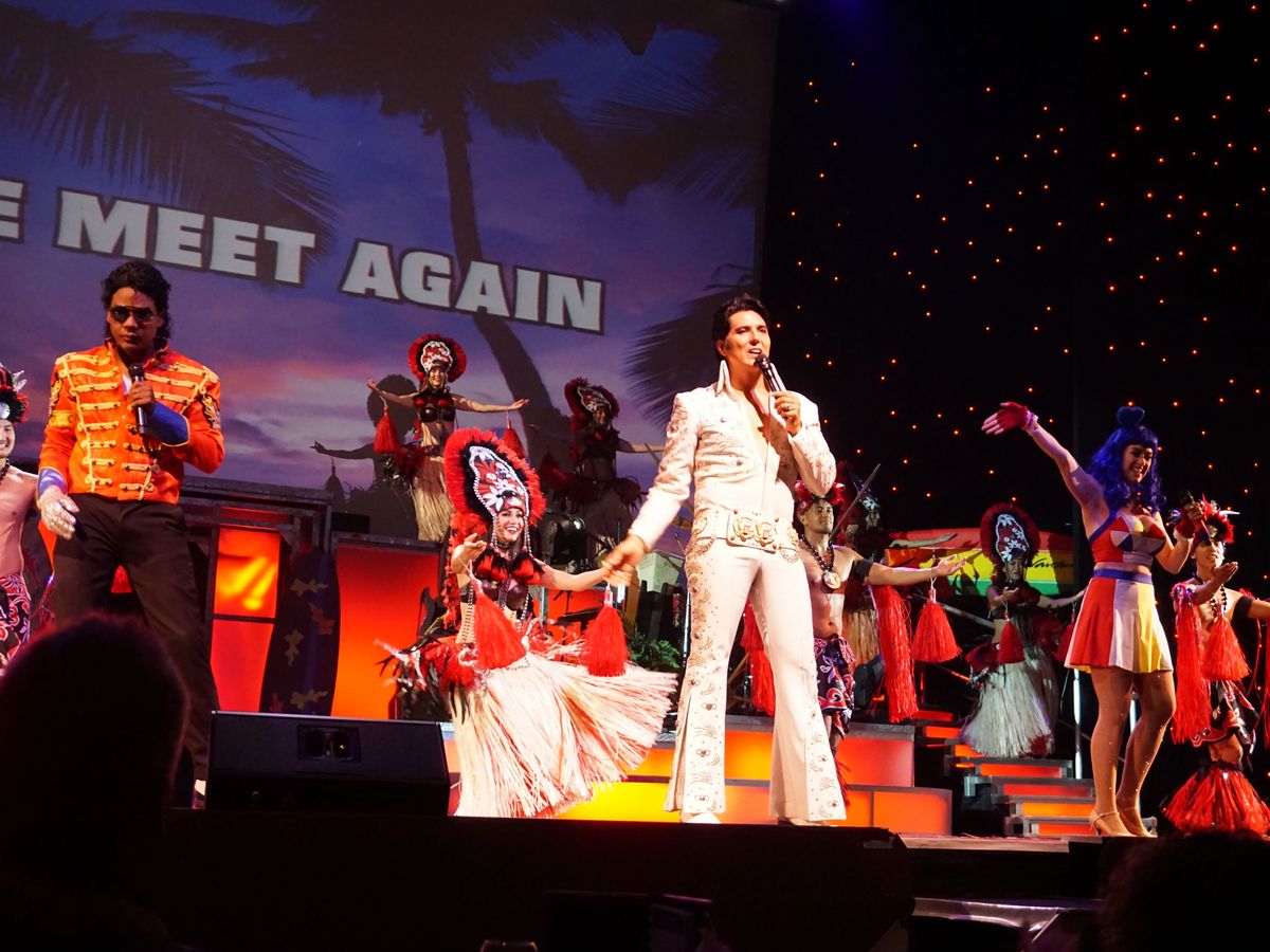 エルビスのものまねステージを見たくて、このショーを見てきました。エルビスの持ち歌でもっとよく知られている歌を聴きたかったのですが、ハワイアンの歌も何曲かあって、やや拍子抜けでした。しかし、マイケル・ジャクソンを真似た歌手の声質がとても似ていたように思います。透明感のある声を似せるのはとても難しいと思うからです。ショー全体としては賑やかで楽しく、時間が経つのも忘れるほどでした。