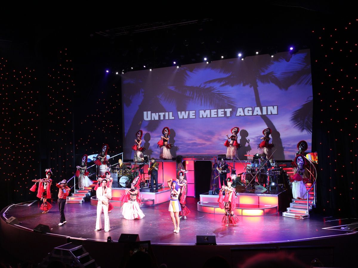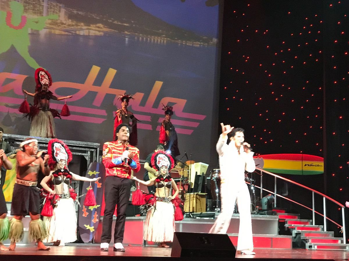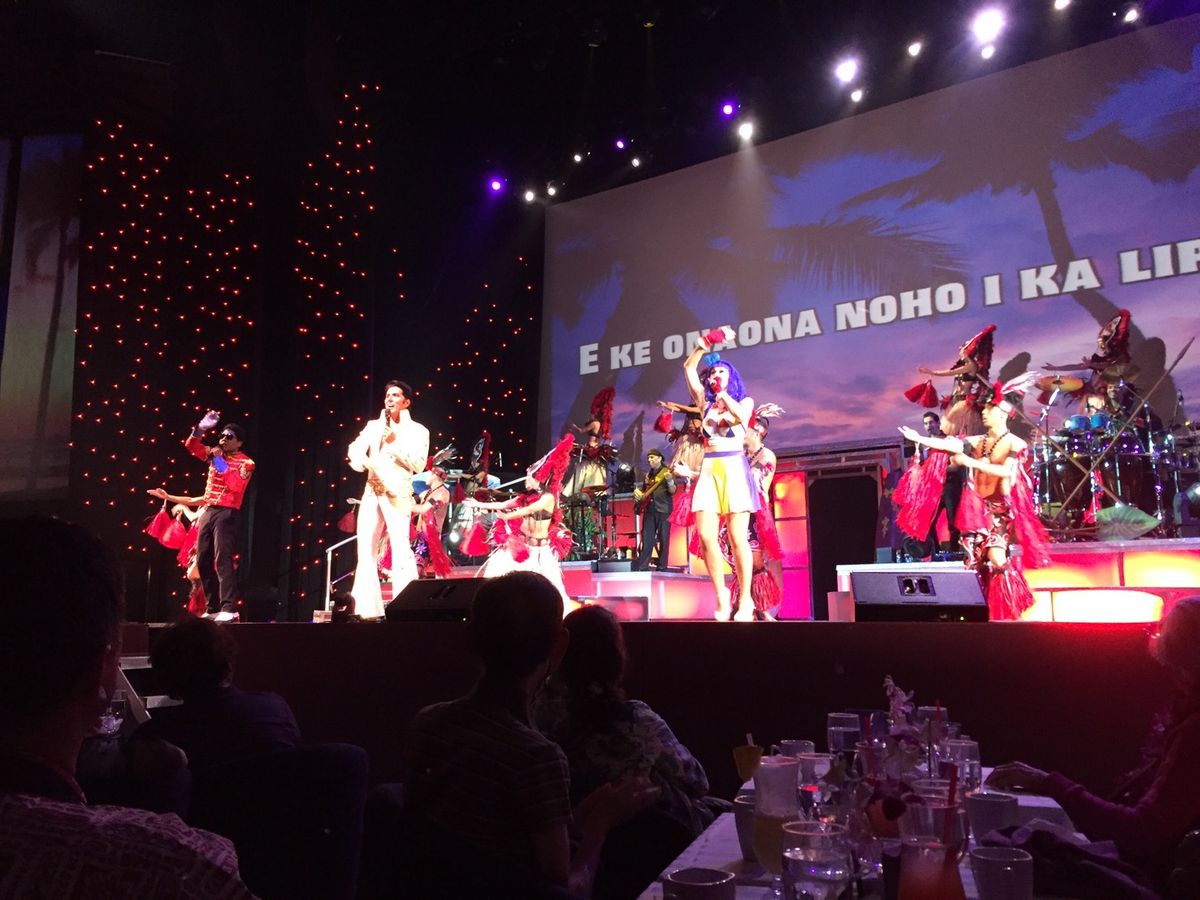 ハワイ疲れで最初はウトウトしてましたが、はっと目覚め見始めると、目が釘ずけになりました。プレスリーやマイケルはもちろん素晴らしいのですが、バックで踊っている方々がフラはもちろんの事どんなダンスでも次々とこなし、ビックリしました。それが最初の食事の時にドリンクを運んで来てくれたスタッフだとわかり、ますますビックリ。いやー、凄いです。見応えあって、オススメです。バイキングの食事はいまいちかも。で、星4つ。