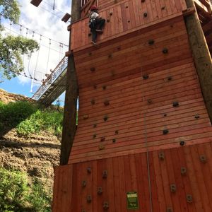 他に、タワーの頂上高さ15メートルのところから飛び降りる「フリーフォール」、頂上の一段下(?)あたりから飛び降りたら振り子のように揺られる(ロープ1本で吊られてブランコの様に動くイメージ)「ジャイアントスウィング」、タワーの壁に取り付けられたホールドを使って頂上まで登る「クライミングウオール」(ボルダリング)で約90分間あっと言う間でした。