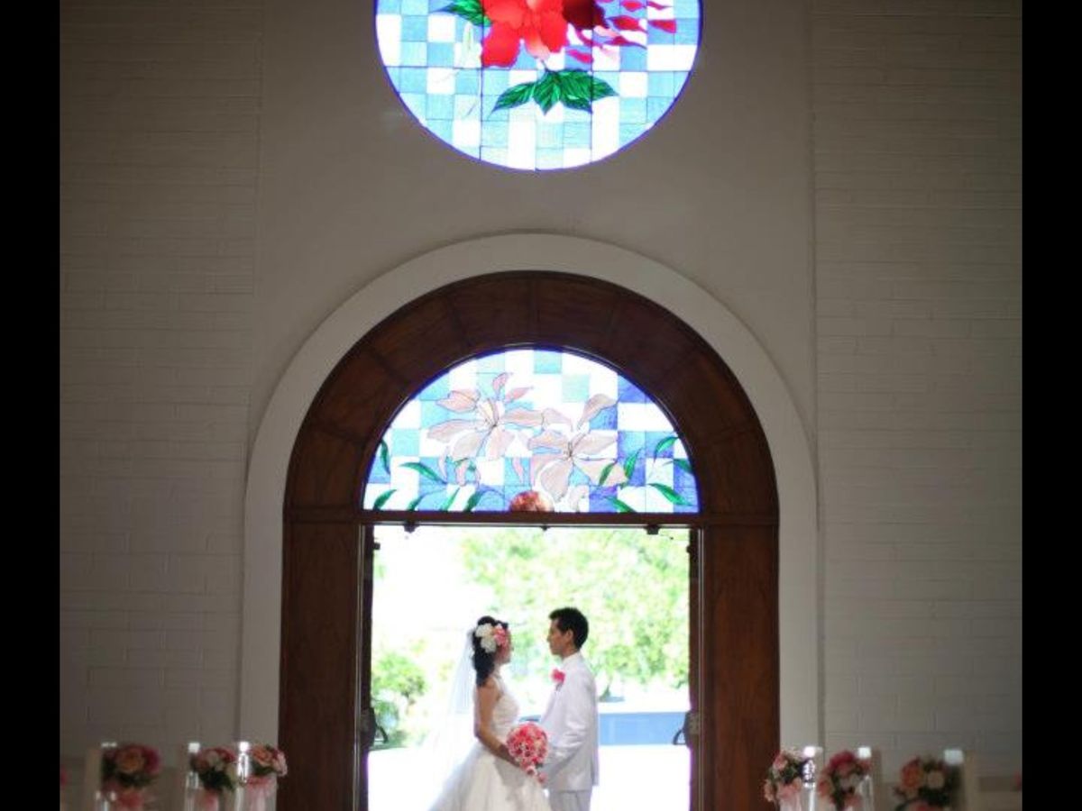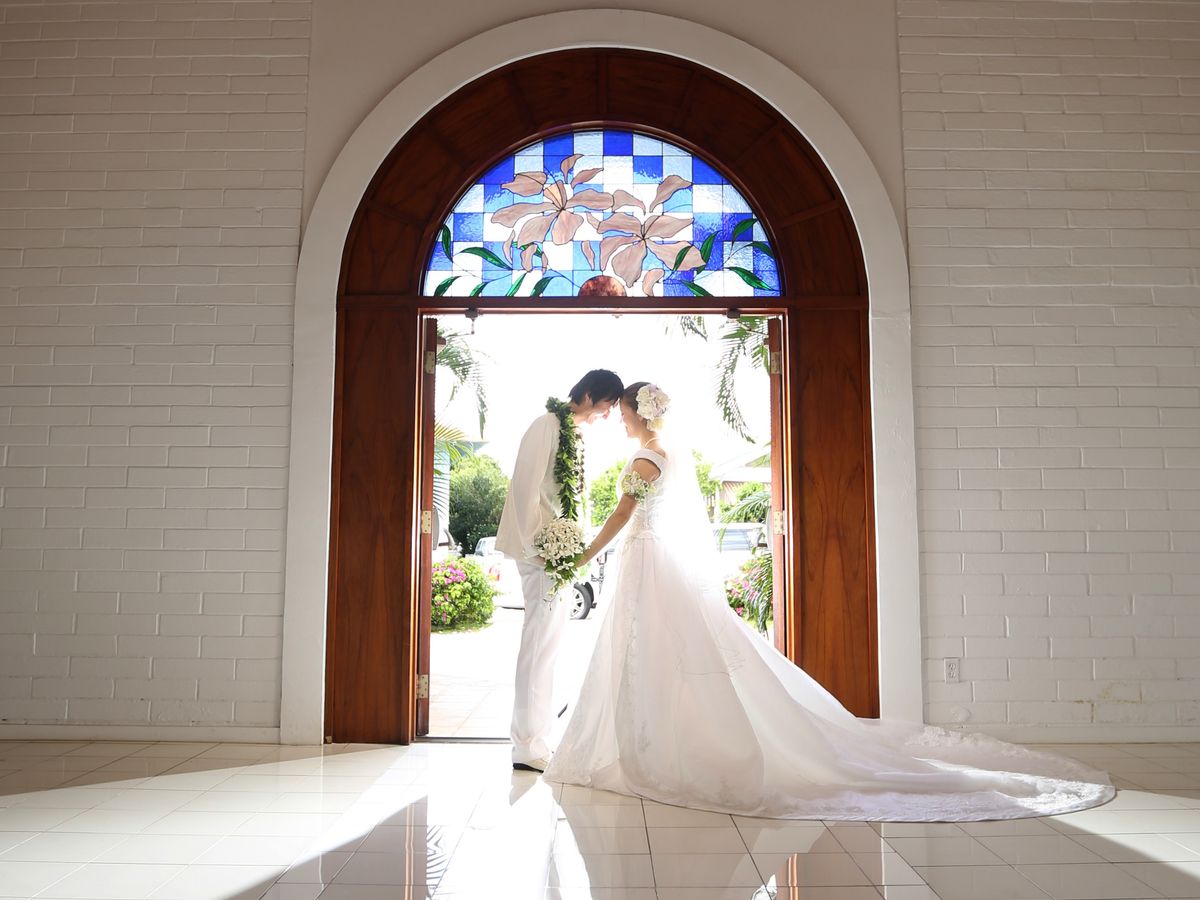 ハワイの小さな教会で、ウェディングドレスを着て